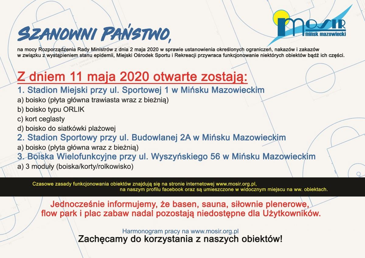 MOSiR przywraca funkcjonowanie niektórych swoich obiektów. Szczegóły na www.mosir.org.pl