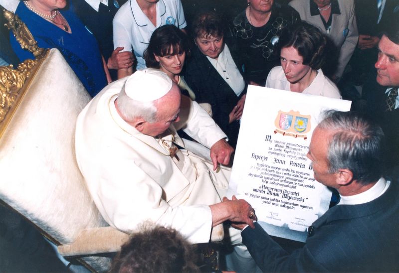 Ale papież Jan Paweł II to przede wszystkim honorowy obywatel samorządów polskich, gdyż spośród wielu zasłużonych dla Polski osób, bodaj właśnie Jan Paweł II jest najczęściej spotykanym honorowym obywatelem polskich miast. Podczas kolejnej pielgrzymki do ojczyzny Jan Paweł II, z wniosku trzech mińskich stowarzyszeń do kapituły ds. tytułów honorowych, której mistrzem był Krzysztof Szczypiorski, a kanclerzem Janusz Kuligowski, Rada Miasta 10 marca 1999 roku nadała Janowi Pawłowi II tytuł Honorowy Obywatel Miasta Mińsk Mazowiecki (Uchwała RM Nr VI/51/99). Było to w skali Polski jedno z pierwszych nadań honorowego obywatelstwa samorządu. Tytuł został wręczony na audiencji indywidualnej na Watykanie 11 kwietnia 1999 r. w trakcie pielgrzymki z mińskiej parafii Św. Antoniego. Dyplom wręczył papieżowi ówczesny miński burmistrz Zbigniew Grzesiak, a symboliczne klucze miasta ówczesny radny miasta Ryszard Luba.