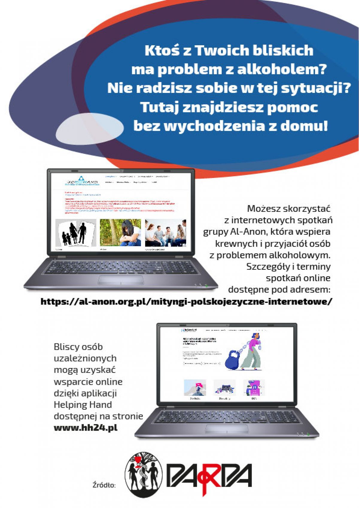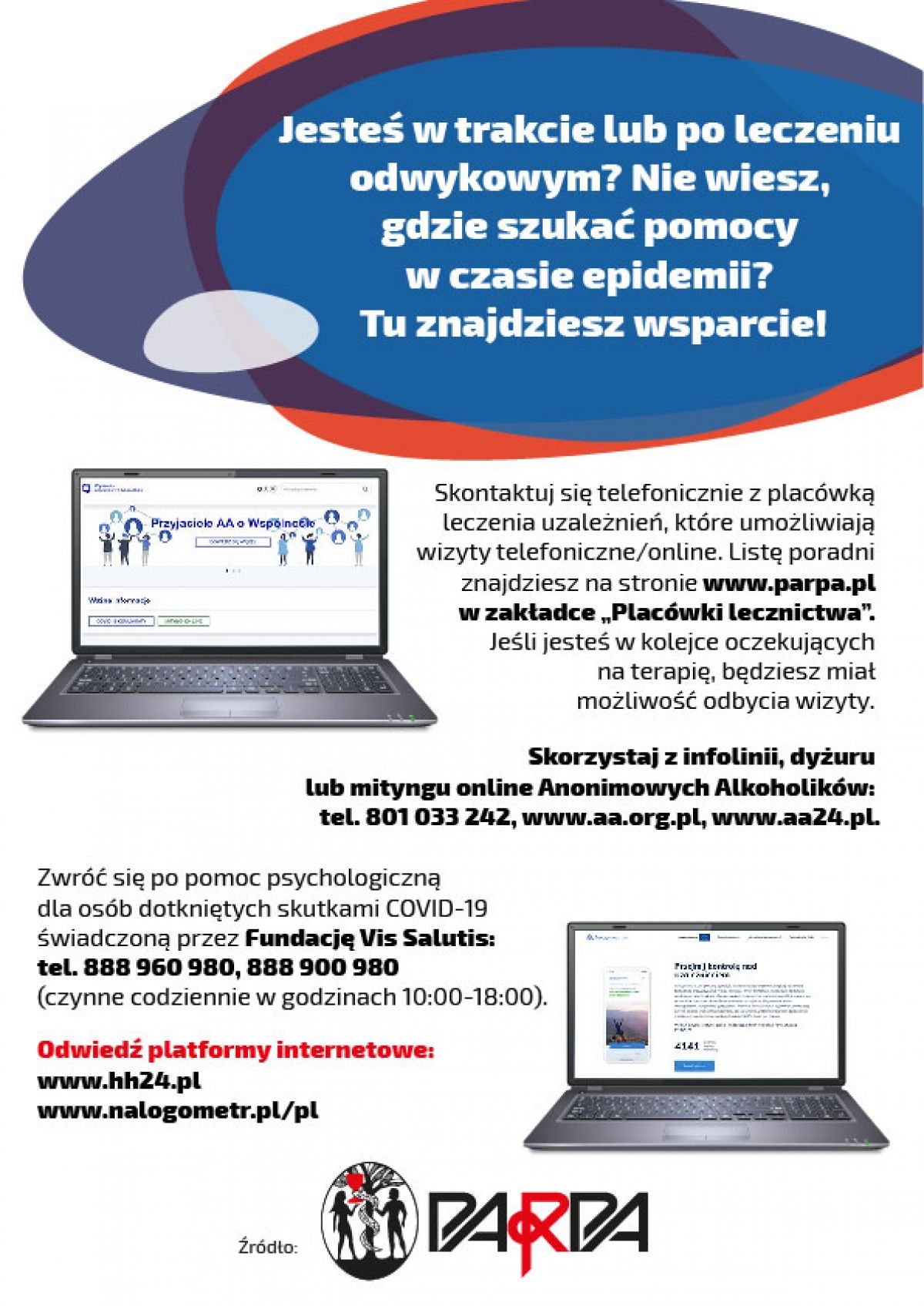 Ci, którzy przed wybuchem epidemii rozpoczęli terapię współuzależnienia w poradni, mają możliwość jej kontynuowania. W związku z ograniczeniami zalecane są rozmowy online lub telefoniczne. Szczegóły można uzyskać, kontaktując się z właściwą placówką.