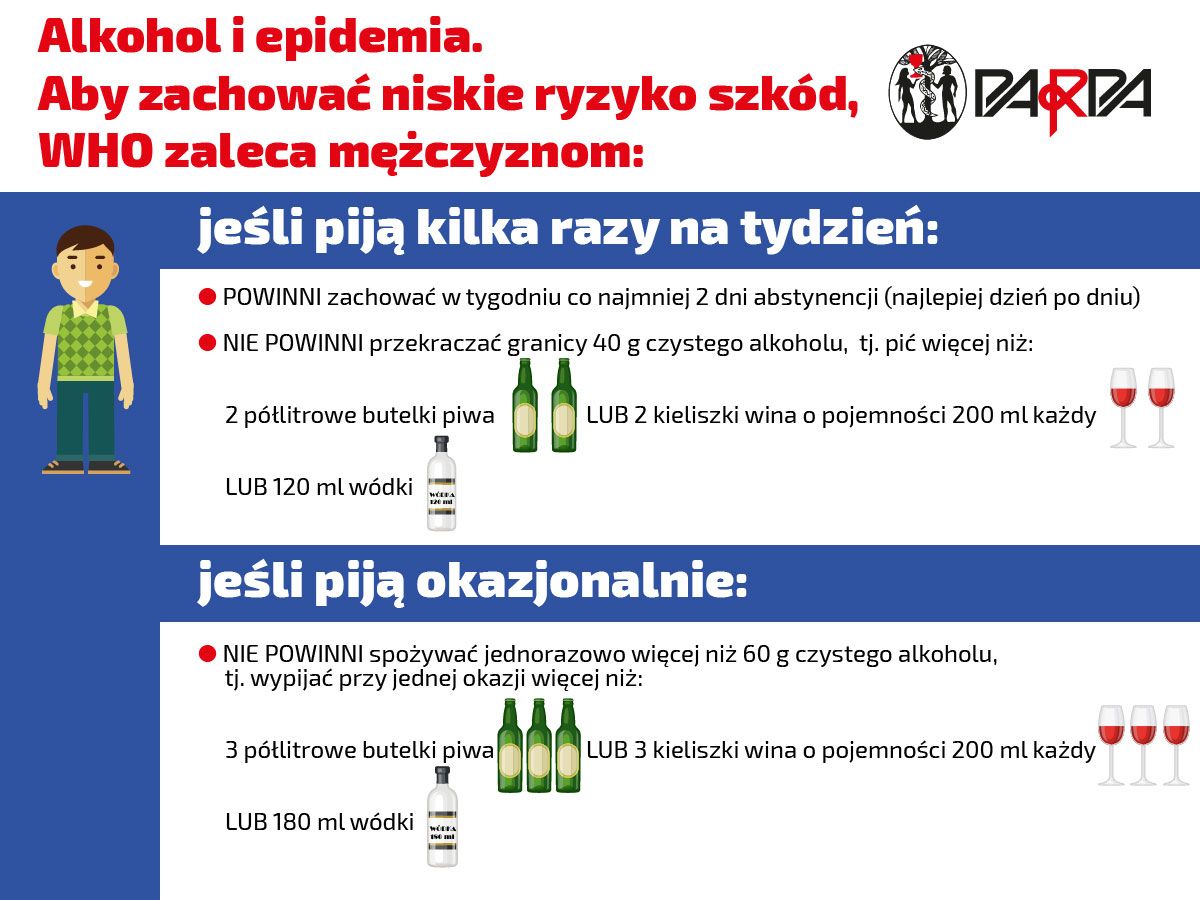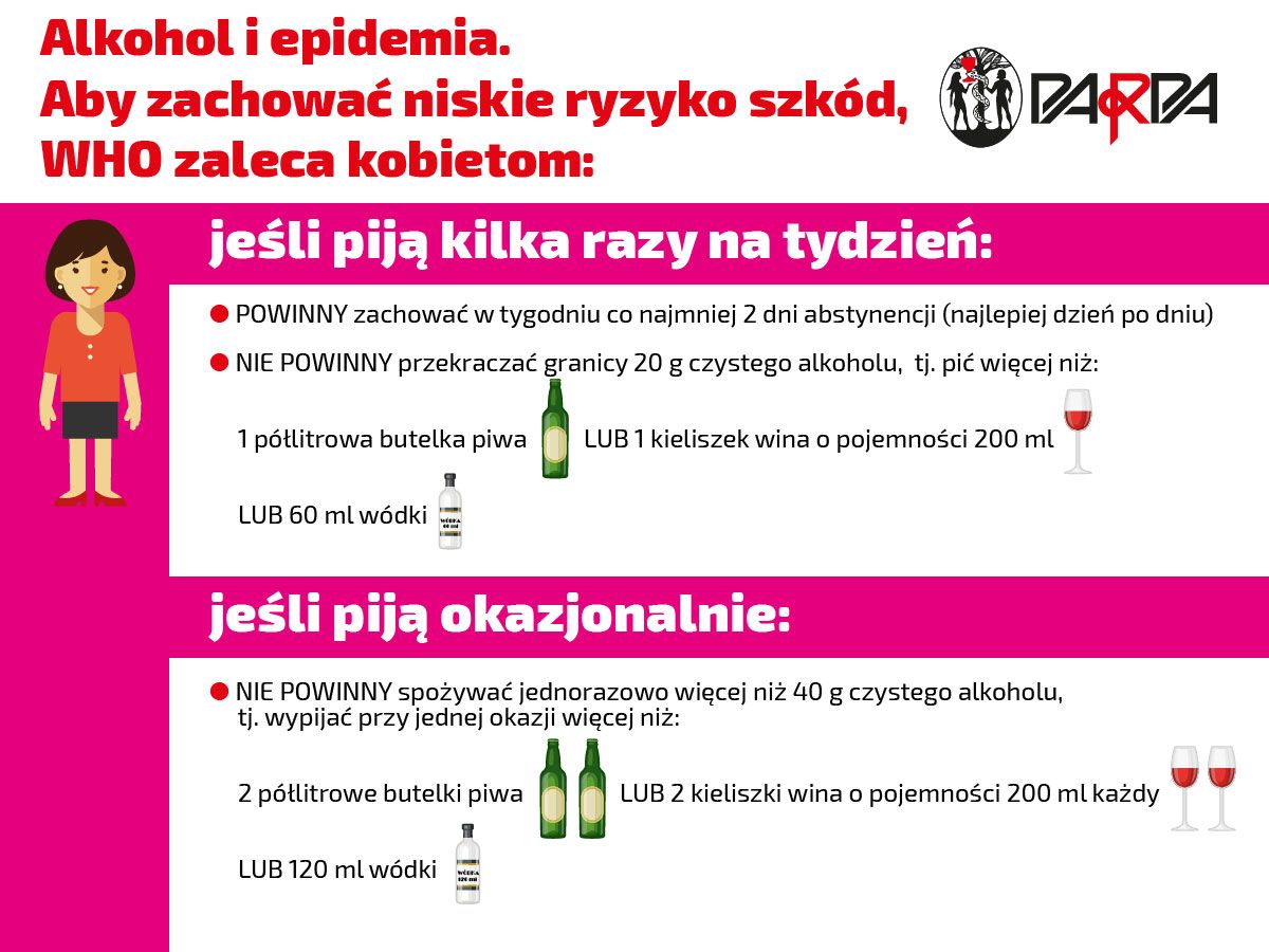 Światowa Organizacja Zdrowia podkreśla, że nie ma bezpiecznej dawki – istnieją jednak limity spożywania alkoholu o niskim poziomie ryzyka szkód (różne w zależności m.in. od płci). Przykładowo mężczyzna, który pije kilka razy w tygodniu, nie powinien dziennie  przekraczać granicy 40 g czystego alkoholu – czyli nie powinien pić więcej niż 2 półlitrowe butelki piwa lub 2 kieliszki wina (o pojemności 200 ml każdy) lub 120 ml wódki. W ciągu tygodnia panowie nie powinni wypijać więcej niż 280 ml stuprocentowego alkoholu (tyle znajduje się np. w 13 półlitrowych butelkach piwa, 0,8 l wódki czy nieco ponad 3 butelkach wina). Dla kobiet limit ustalony przez WHO jest o połowie mniejszy. Uwaga – wypicie podanych dawek alkoholu jednorazowo nie jest bezpieczne!