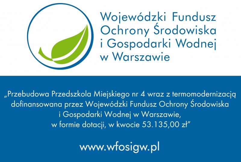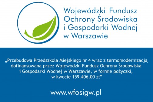 Przebudowa Przedszkola Miejskiego nr 4 wraz z termomodernizacją została dofinansowana przez Wojewódzki Fundusz Ochrony Środowiska i Gospodarki Wodnej  w Warszawie  w formie dotacji  w kwocie 53 135 zł i w formie pożyczki w kwocie 159 406 zł.