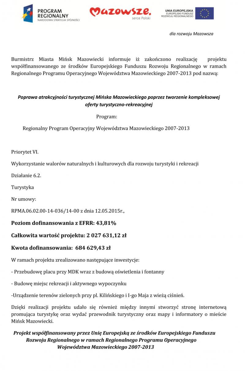 Miło nam poinformować, iż wniosek złożony przez Miasto Mińsk Mazowiecki pt. „POPRAWA ATRAKCYJNOŚCI TURYSTYCZNEJ MIŃSKA MAZOWIECKIEGO POPRZEZ TWORZENIE KOMPLEKSOWEJ OFERTY TURYSTYCZNO-REKREACYJNEJ” uplasował się na 3 miejscu listy rankingowej otrzymując 108,50 punktów, co stanowi 94,35% maksymalnej liczby punktów możliwych do zdobycia. Kwota dofinansowania wyniosła 684.629,43 zł, przy całkowitej wartości projektu 2.027.631,12 zł. Wniosek został złożony w ramach konkursu otwartego bez preselekcji RPOWM/6.2/1/2014 Priorytet VI „Wykorzystanie walorów naturalnych i kulturowych dla rozwoju turystyki i rekreacji” dla Działania 6.2 „Turystyka” Regionalnego Programu Operacyjnego Województwa Mazowieckiego 2007-2013. Projekt obejmuje m.in. zwrot kosztów przebudowy placu przy Pałacu Dernałowiczów wraz z budową oświetlenia i fontanny, utworzenia plenerowych siłowni miejskich. Ponadto w ramach dofinansowania zostanie utworzony szlak turystyczny „kulturalno – sportowy Mińsk Mazowiecki”, na wszystkich miejskich przystankach będą umieszczone plakaty informujące o atrakcjach historycznych, kulturalnych i artystycznych miasta. W Miejskiej Bibliotece Publicznej i Muzeum Ziemi Mińskiej powstaną punkty obsługi turystów, zostanie stworzona strona internetowa oraz materiały informacyjne promujące turystykę.