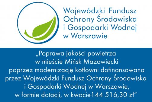 Miasto Mińsk Mazowiecki zakończyło realizacje  projektu pt. "Poprawa jakości powietrza w mieście Mińsk Mazowiecki poprzez modernizacje kotłowni” realizowanego dzięki dofinansowaniu z Wojewódzkiego Funduszu Ochrony Środowiska i Gospodarki Wodnej w Warszawie w ramach programu „Poprawa jakości powietrza na terenie województwa mazowieckiego – ograniczenie emisji zanieczyszczeń poprzez modernizację kotłowni”.