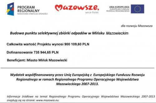 Miasto Mińsk Mazowiecki (Wydział Gospodarki Komunalnej) – w ramach dofinansowania w Działania 4.2 „Ochrona powierzchni ziemi” – „Segregacja odpadów” – Regionalnego Programu Operacyjnego Województwa Mazowieckiego na lata 2007-2013 wybudowano Punkt Selektywnej Zbiórki Odpadów Komunalnych (PSZOK). Wykonano utwardzenie i oświetlenie terenu, ogrodzenie terenu, wybudowano wiaty oraz ustawiono kontenerowy budynek administracyjno-socjalny, do którego podłączono energię, kanalizację i wodę. Wykonawcą inwestycji była firma Roboty Drogowe i Brukarskie Mirosław Krysiuk z Mińska Mazowieckiego.