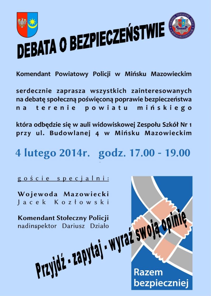 Kolejny raz mieszkańcy powiatu mińskiego będą mieli okazję spotkać się z policjantami podczas debaty społecznej, zaplanowanej na dzień 4 lutego 2014 roku, w godzinach 17.00-19.00, która odbędzie się w auli widowiskowej Zespołu Szkół nr 1 im. Kazimierza Wielkiego, przy ulicy Budowlanej 4 w Mińsku Mazowieckim. Gośćmi specjalnymi będą: Wojewoda Mazowiecki Jacek Kozłowski oraz Komendant Stołeczny Policji nadinspektor Dariusz Działo. Komendant Powiatowy Policji w Mińsku Mazowieckim młodszy inspektor Robert Żebrowski serdecznie zaprasza wszystkich  zainteresowanych do udziału w debacie społecznej. Głównym i przewodnim tematem będzie, tak jak podczas poprzedniej debaty powiatowej, bezpieczeństwo publiczne w różnych sferach i dziedzinach.