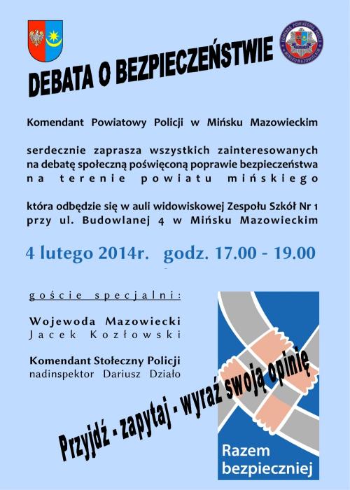 Komendant Powiatowy Policji w Mińsku Mazowieckim młodszy inspektor Robert Żebrowski serdecznie zaprasza wszystkich zainteresowanych, mieszkańców i osoby, którym bliskie jest bezpieczeństwo publiczne do udziału w debacie społecznej, która odbędzie się 4 lutego 2014 roku w godzinach 17.00-19.00 w auli widowiskowej Zespołu Szkół nr 1 im. Kazimierza Wielkiego, przy ulicy Budowlanej 4 w Mińsku Mazowieckim. Zapowiedzianymi gośćmi specjalnymi będą: Wojewoda Mazowiecki Jacek Kozłowski oraz Komendant Stołeczny Policji nadinspektor Dariusz Działo.
