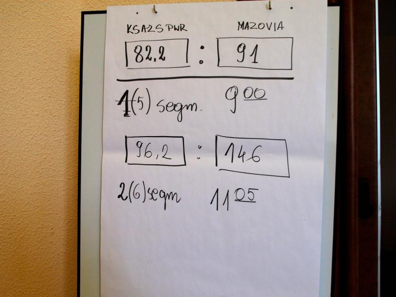 Mecz odbył się w dniach 12 -13.04 we Wrocławiu , składał się z 6 segmentów po 12 rozdań każdy a drużyna wrocławska jako zespół z wyższej ligi otrzymał na starcie zgodnie z regulaminem dodatkowy bonus w postaci 7,2 punktu .Po pierwszym segmencie prowadzenie objęła „Mazovia” , następne dwa należały do AZS PWR II Wrocław, która objęła prowadzenie w stosunku 76,2 : 57. W tym momencie przeciwnicy uwierzyli, że mecz jest już rozstrzygnięty, ale nic bardziej mylnego. W ostatnim granym w sobotę czwartym segmencie „Mazovia” odrobiła straty i przed niedzielnymi zmaganiami uzyskała niewielką / 8,8 pkt / przewagę . Decydującym okazał się segment nr 5 w którym mińscy brydżyści mówiąc językiem bokserskim znokautowali rywali wygrywając ten fragment w stosunku 55 : 14. Ostatni 6 segment był nieomal formalnością i zakończył się również zwycięstwem naszych zawodników w stosunku 15 : 12 , a w całym meczu drużyna „Mazovia” wysoko pokonała faworyta ekipę KS AZS PWR II Wrocław w stosunku 161 : 108,2 pkt. Dla pewnych siebie przeciwników był to zimny prysznic a ich szok z tytułu porażki był tak duży , że nie zdobyli się nawet na złożenie zwycięzcom gratulacji i podziękowań za grę. Cóż bywa i tak . Niezgodne z ideą fair play zachowanie gospodarzy nie miało wpływu na radość i szczęście brydżystów „Mazovii” z tytułu awansu a właściwie powrotu po rocznej przerwie do rozgrywek I ligi. We Wrocławiu barw naszej drużyny godnie bronili : Krzysztof Kulka, Krzysztof Roguski, Jan Nadaj, Adnrzej Ogłoblin, Cezary Przasnek oraz Maciej Modrzejewski.