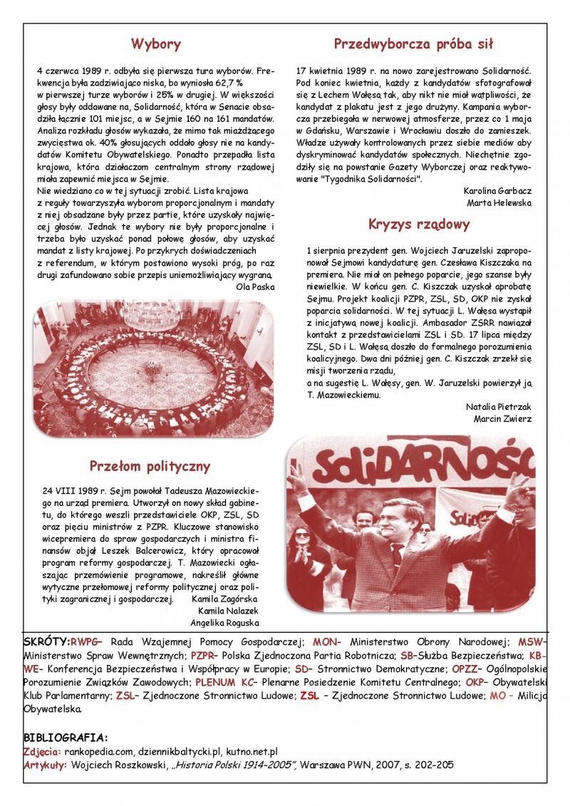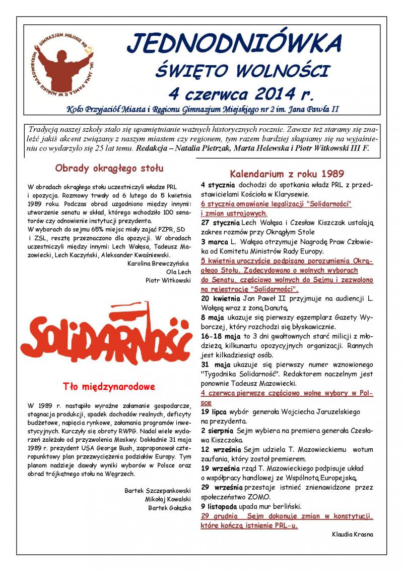 Następnie uczniowie gimnazjum uczestniczyli w Lekcjach Wolności, które przeprowadzili dla nich nauczyciele historii i wiedzy o społeczeństwie. Uczniowie siedmiu klas trzecich gimnazjum wzięli udział w cyklu zajęć Lekcja Wolności przeprowadzonych przez nauczycielkę historii dr Lillę Kłos. Na lekcjach poznali  tło historyczne wydarzeń, a następnie sami zapoznali się z faktami zawartymi w Historii Polski 1914-2005 Wojciecha Roszkowskiego. Na podstawie lektury uczniowie napisali artykuły, które umieścili w okolicznościowych Jednodniówkach. W ten sposób powstało 7 okolicznościowych klasowych gazetek.  Jednodniówka kl. IIIf   wybrana przez jury pod przewodnictwem dyrektora Grzegorza Wyszogrodzkiego jako najciekawsza została powielona i rozdawana 4 czerwca na ulicach miasta.