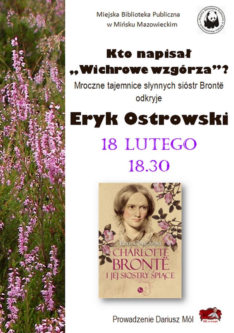 Kto naprawdę jest autorem słynnych „Wichrowych wzgórz”? O tym i wielu innych sekretach rodziny Brontë opowie Eryk Ostrowski, autor książki „Charlotte Brontë i jej siostry śpiące”, który z pasją i odwagą obnaża mroczne tajemnice. Spotkanie odbędzie się we wtorek, 18 lutego 2014 r. o godz. 18.30 w Miejskiej Bibliotece Publicznej w Mińsku Mazowieckim. Serdecznie zapraszamy!
