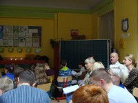 Z kolei   w czwartkowy wieczór 9 stycznia spotkaliśmy się wraz z rodzicami (kto mógł), rodzeństwem lub tylko z koleżankami i kolegami. W sali pierwszoklasistów dostawiono wiele krzeseł. Zabawnie to wyglądało, gdy dorośli siedzieli na niskich krzesełkach wraz z maluchami. Nie to było jednak najważniejsze. Pragnęliśmy w tym pięknym czasie razem trwać w świątecznym, bożonarodzeniowym nastroju. Salę szczelnie wypełniły dzieciaki, rodzice, dziadkowie, księża i nauczyciele. Po krótkim powitaniu wychowawczyni klasy IV (pani Ewy Majewskiej) repertuar kolęd nasuwał się sam. Nikt niczego nie narzucał. Po zaśpiewaniu „Przybieżeli do Betlejem”, następne intonowali sami zebrani. Pan Daniel Gałązka i jego syn Maciek pięknie towarzyszyli nam na instrumentach (gitara, bębny). Wzruszyłam się, gdy o narodzeniu małego, Bożego Dzieciątka które przyszło na świat wiele tysięcy lat temu, grał na akordeonie klasowy kolega Maksymilian Matasek.