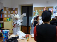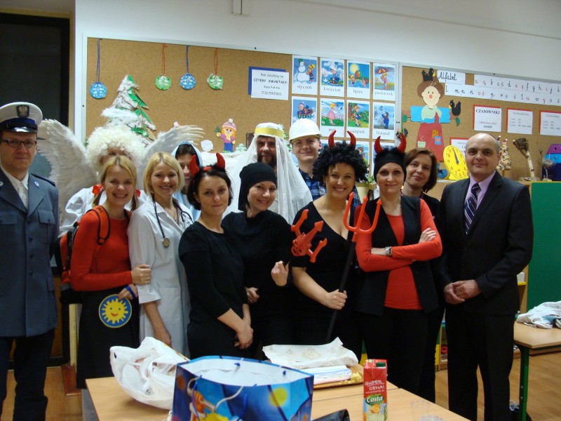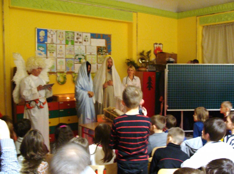 Po wspólnym kolędowaniu prawdziwą niespodziankę przygotowali rodzice. Przedstawili zebranym, dotąd ściśle utrzymywane w tajemnicy, „nietypowe” jasełka. Oprócz Maryi, Józefa, Jezuska – na klasową scenę wkroczyli burmistrz, murarz, pielęgniarka, nauczycielka i policjant. Z przedstawienia wynikało jasno, że anioł objawia wciąż kolejnym pokoleniom narodzenie Chrystusa. Szczególnie zadziwiały efekty specjalne: gra świateł, dźwięki rodem z piekła, no i pomysłowe stroje. Aktorom dziękowaliśmy na stojąco, brawami. Występ zakończyła jedna z mam, pani Anna Niemczak, która zaprosiła nas na poczęstunek i wspólne spotkanie za rok. To już od kilku lat jest tradycją mojej szkoły.
