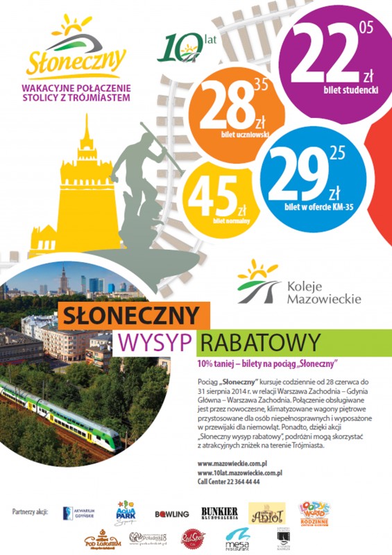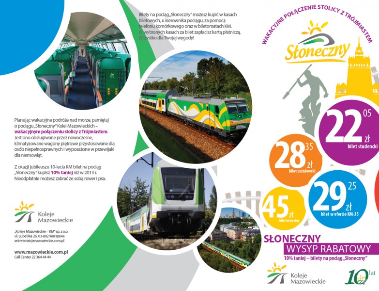 Z okazji jubileuszu 10-lecia Kolei Mazowieckich bilety na pociąg „Słoneczny” kosztują 10% taniej niż w 2013 r. Można je kupić w kasach biletowych, u kierownika pociągu, za pomocą telefonu komórkowego oraz w biletomatach KM. Przewóz roweru i psa jest nieodpłatny. Rozkład jazdy dostępny jest na stronie www.mazowieckie.com.pl.