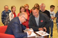 Trwa Mundial 2014, a my w ostatnim tygodniu przed wakacjami zaprosiliśmy młodzież gimnazjalną na „piłkarskie spotkanie”. Gościem Biblioteki 23 czerwca był Stefan Szczepłek, dziennikarz i komentator sportowy, autor fascynującej książki „Deyna”, który bardzo zajmująco opowiadał o gwieździe polskiego futbolu – Kazimierzu Deynie i największych sukcesach naszej reprezentacji. Mówił o wydarzeniach, które przeszły do historii polskiego i światowego futbolu (wiele z nich oglądał na własne oczy), a także o pracy komentatora sportowego. Nie mogło oczywiście zabraknąć spostrzeżeń na temat Mistrzostw Świata w Piłce Nożnej 2014. Autor odpowiadał na liczne pytania publiczności, zaprezentował ponadto wyjątkową koszulkę z autografami Diego Maradony i Leo Messiego. Spotkanie prowadził Dariusz Mól.