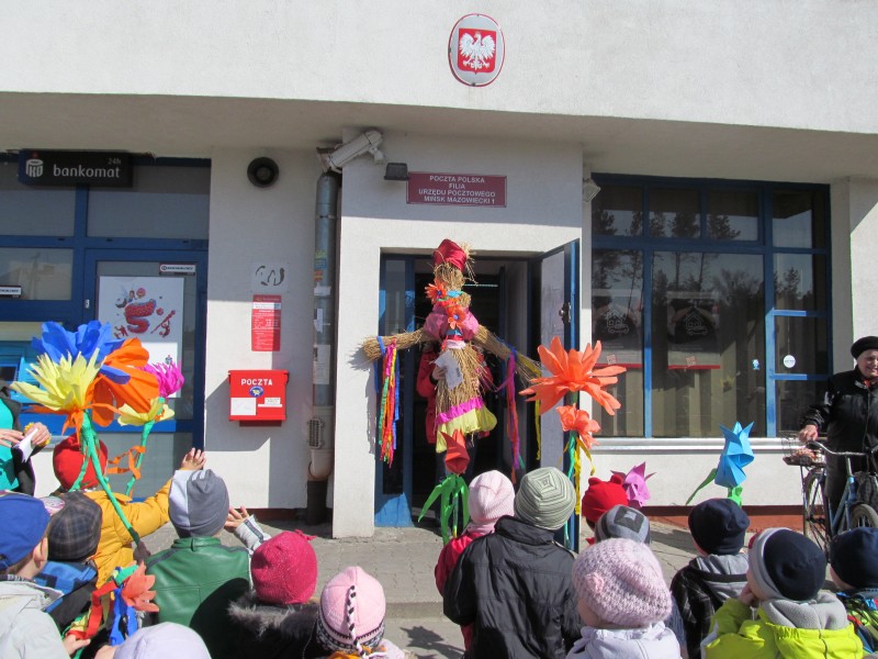 w kolorowym korowodzie dzieci odprowadziły „ Marzannę” na pocztę i wysłały ją  w paczce do Pani Zimy.