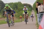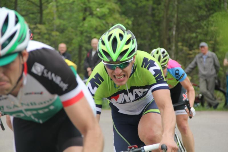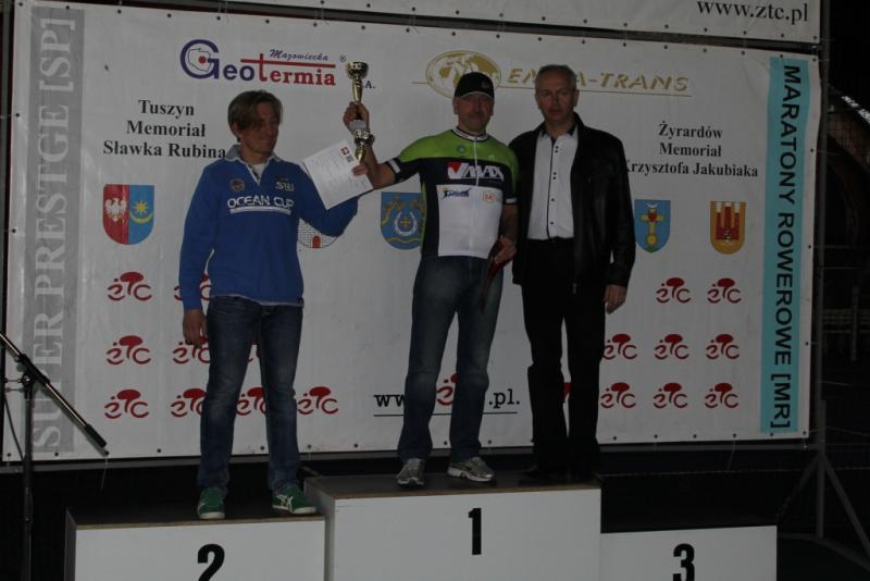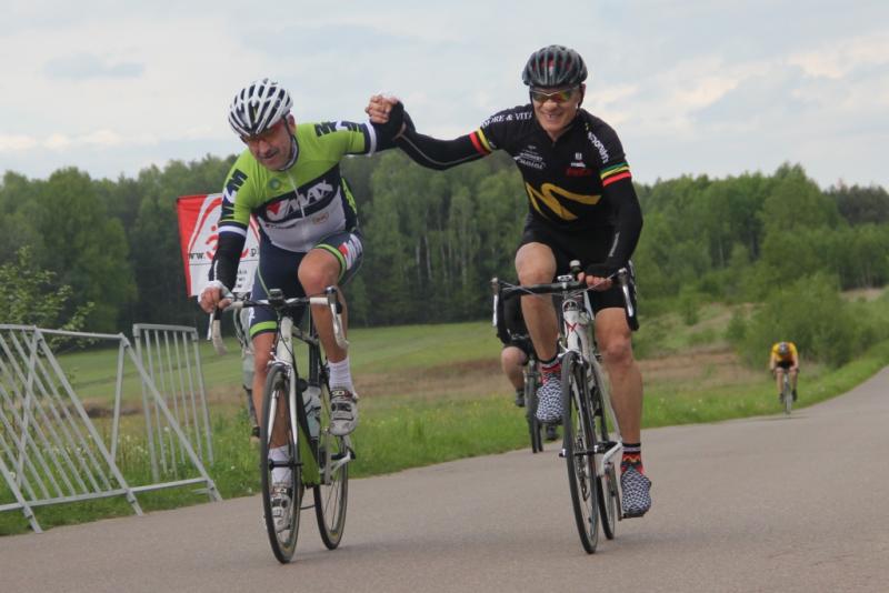 Walka na trasie była niezwykle imponująca i dramatyczna. Niestety między Zakolem a Barczącą doszło do dużej kraksy, w której uczestniczyło kilkunastu zawodników. W peletonie wyraźnie widać było aktywność kilku silnych klubów, chcących zdominować rywalizację. Jednak nic nie zostało rozstrzygnięte i przesądzone aż do samej mety. Nas oczywiście najbardziej interesowali zawodnicy Klubu Kolarskiego V-MAX, którzy wystawili tego dnia do rywalizacji 10-osobową reprezentację. Ponad dwie godziny twardej, męskiej walki pokazało, że mińszczanie potrafią jak zwykle solidnie namieszać. Krzysztof Kryczka w kategorii 17-29 lat, mimo że nie jest typem sprintera, stoczył piękną walkę na finiszu i zajął trzecie miejsce w tej kategorii. Najwięcej satysfakcji dostarczył nam jednak inny kolarz V-MAX-u - Tomek Czyżkowski. W kategorii 40-49 lat, niezwykle doświadczony i wszechstronny zawodnik mińskiego klubu już na piętnastym kilometrze zainicjował dwuosobową ucieczkę, która początkowo została zignorowana przez peleton. Jak się później okazało była to "akcja dnia". Obaj uciekinierzy dziękując sobie za świetną współpracę, trzymając się za ręce wspólnie przekroczyli linię mety w Chmielewie. To było drugie pudło tego dnia dla V-MAX-u - tym razem najwyższe.