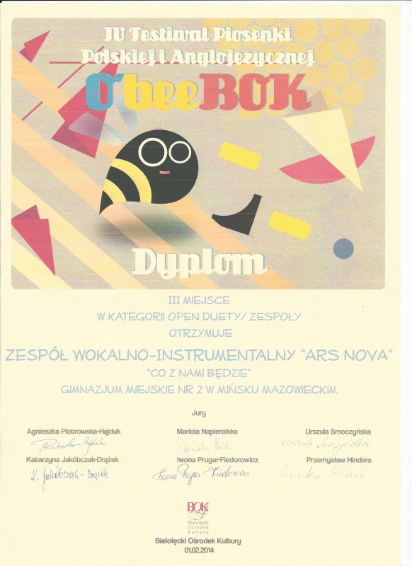 Zespół Wokalno-Instrumentalny z Gimnazjum Miejskiego nr 2 im. Jana Pawła II kierowany przez panią Magdalenę Jakubowską zajął III miejsce w IV Ogólnopolskim Festiwalu Piosenki Polskiej i Anglojęzycznej „OBeeBOK” organizowanym przez Białołęcki Dom Kultury w Warszawie.
