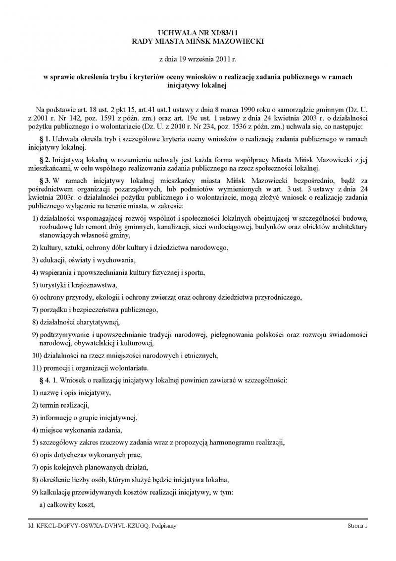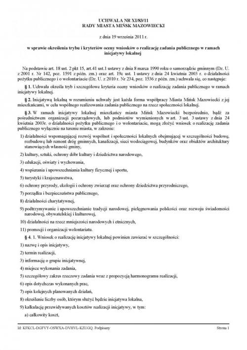 Uchwała Nr XI/83/11 Rady Miasta Mińsk Mazowiecki w sprawie określenia trybu i kryteriów oceny wniosków o realizację zadania publicznego w ramach inicjatywy lokalnej.