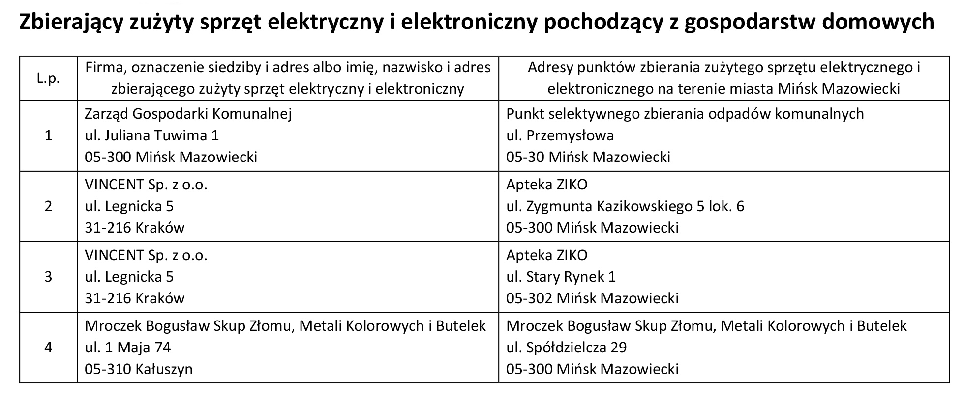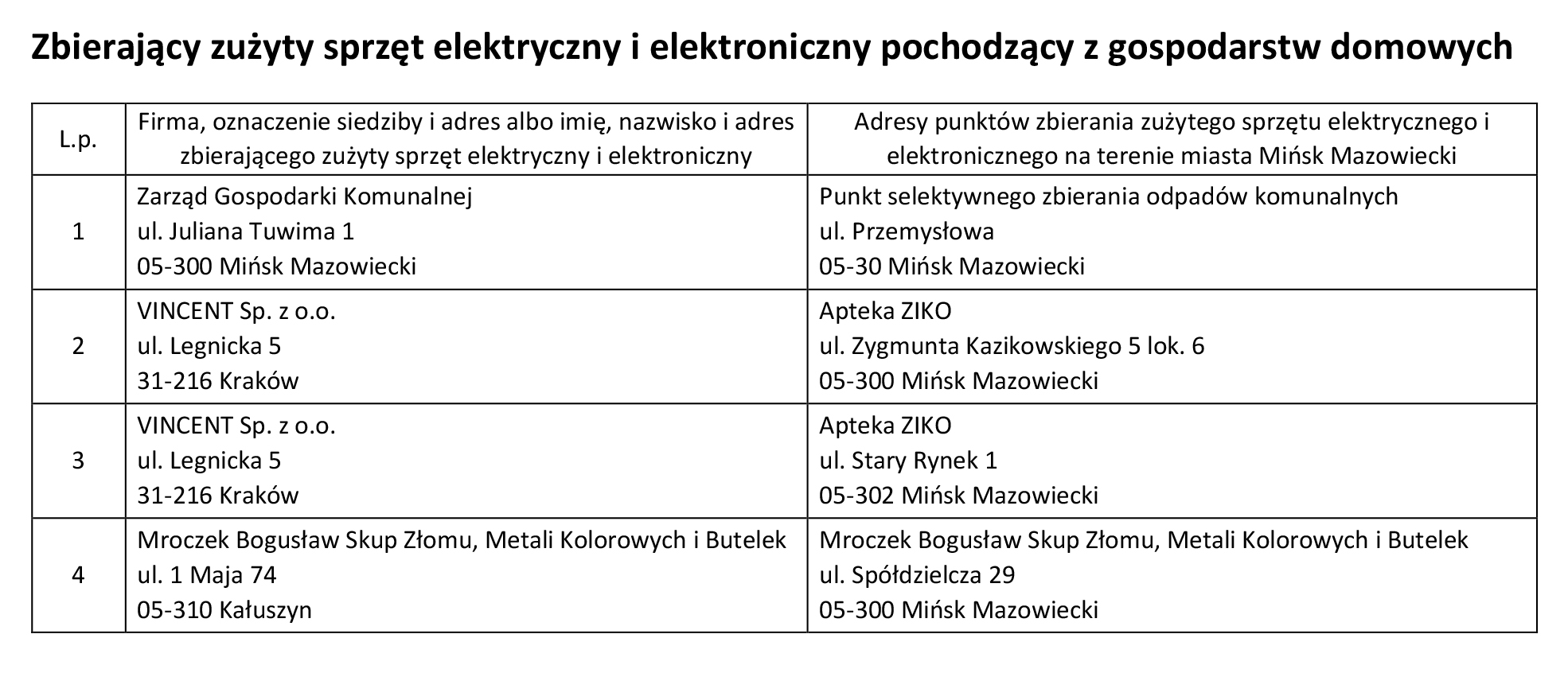 Wykaz podmiotów wpisanych do prowadzonego przez Burmistrza Miasta Mińsk Mazowiecki rejestru działalności regulowanej w zakresie odbierania odpadów komunalnych od właścicieli nieruchomości z terenu miasta Mińsk Mazowiecki.