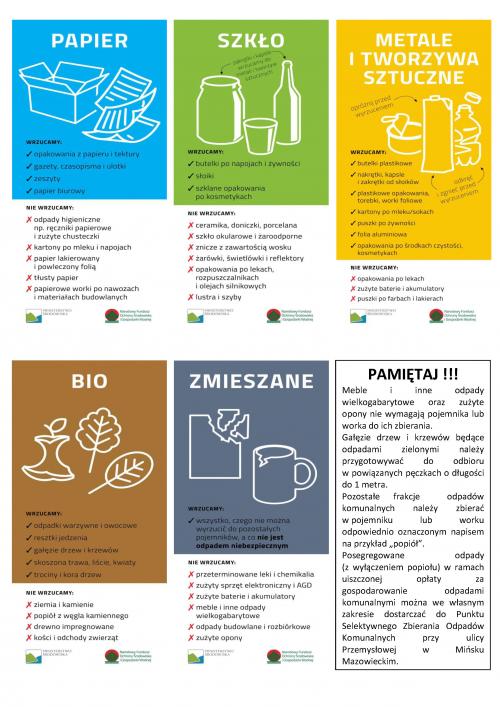 Do PSZOK każdy właściciel nieruchomości w ramach uiszczonej opłaty za gospodarowanie odpadami komunalnymi może dostarczać odpady zielone, zużyte opony, odpady budowlane i rozbiórkowe stanowiące odpady komunalne, meble i inne odpady wielkogabarytowe, zużyty sprzęt elektryczny i elektroniczny, zużyte baterie i akumulatory, papier, szkło, metale, tworzywa sztuczne, odpady ulegające biodegradacji, ze szczególnym uwzględnieniem bioodpadów oraz przeterminowane leki i chemikalia. Przeterminowane leki można również dostarczać do aptek w Mińsku Mazowieckim przy ulicach:
