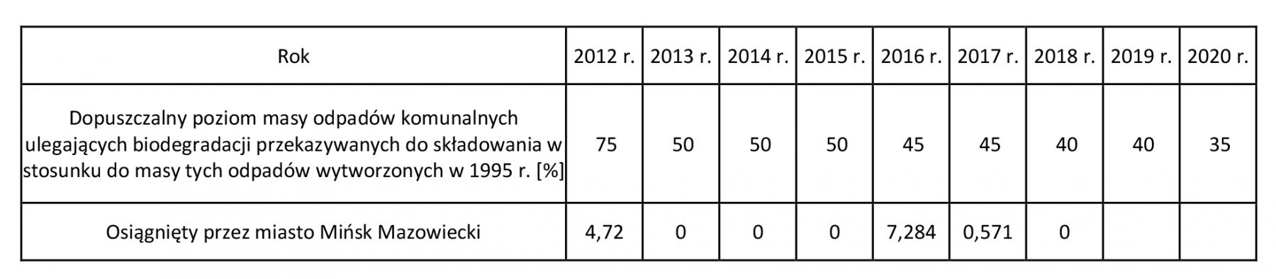 Określony do osiągnięcia w poszczególnych latach w Rozporządzeniu Ministra Środowiska z dnia 25 maja 2012 r. w sprawie poziomów ograniczenia masy odpadów komunalnych ulegających biodegradacji przekazanych do składowania oraz sposobu obliczania poziomu ograniczania masy tych odpadów zastąpionym Rozporządzeniem Ministra Środowiska z dnia 15 grudnia 2017 r. w sprawie poziomów ograniczenia składowania masy odpadów komunalnych ulegających biodegradacji, poziom ograniczenia masy odpadów komunalnych ulegających biodegradacji przekazanych do składowania został osiągnięty i wyniósł: