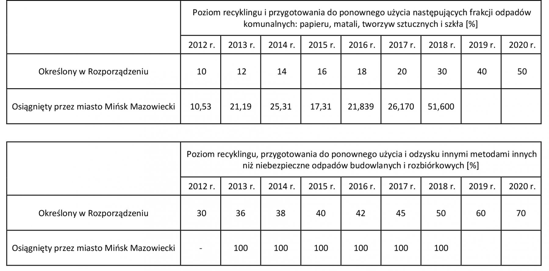 Określone do osiągnięcia w poszczególnych latach w Rozporządzeniu Ministra Środowiska z dnia 14 grudnia 2016 r. w sprawie poziomów recyklingu, przygotowania do ponownego użycia i odzysku innymi metodami niektórych frakcji odpadów, poziomy recyklingu i przygotowania do ponownego użycia następujących frakcji odpadów komunalnych: papieru, matali, tworzyw sztucznych i szkła oraz recyklingu, przygotowania do ponownego użycia i odzysku innymi metodami innych niż niebezpieczne odpadów budowlanych i rozbiórkowych zostały osiągnięte i wyniosły:
