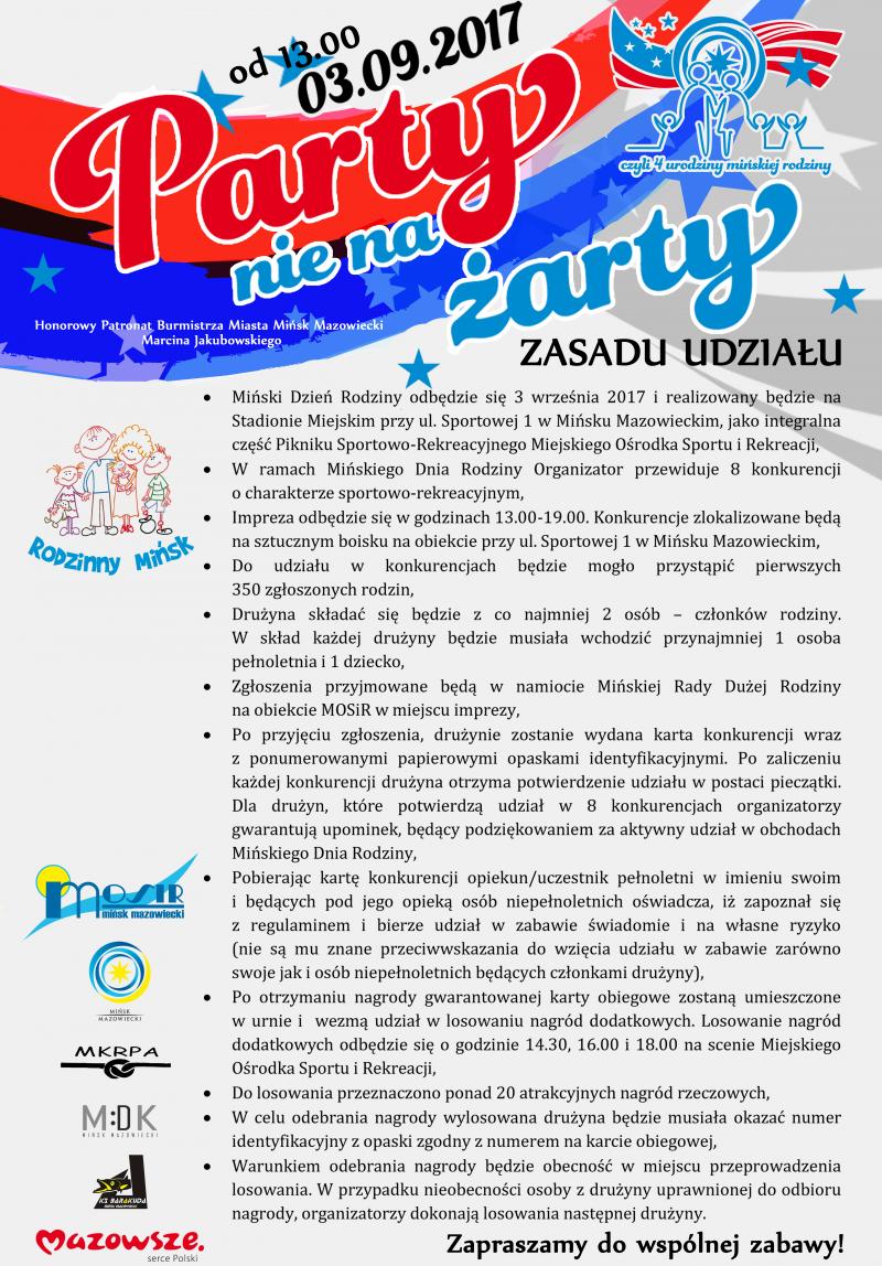 Obchody 4. Mińskiego Dnia Rodziny odbędą się w dniu 3 września 2017 r. w połączeniu z Piknikiem Sportowo – Rekreacyjnym Miejskiego Ośrodka Sportu i Rekreacji. Podczas imprezy organizatorzy zapewnią wiele atrakcji oraz liczne konkursy z cennymi nagrodami dla rodzin z dziećmi. Serdecznie zapraszamy do wspólnej zabawy!