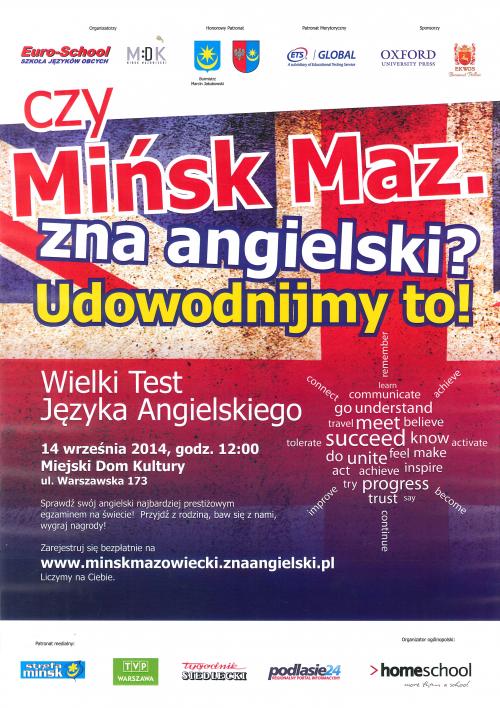 14 września br. o godz. 12.00 w Pałacu Dernałowiczów przy Warszawskiej 173 odbył się Wielki Test Języka Angielskiego, w którym uczestniczyło ok. 170 osób. Mieszkańcy Mińska Mazowieckiego znają angielski na poziomie B2 w skali CEFR Rady Europy.