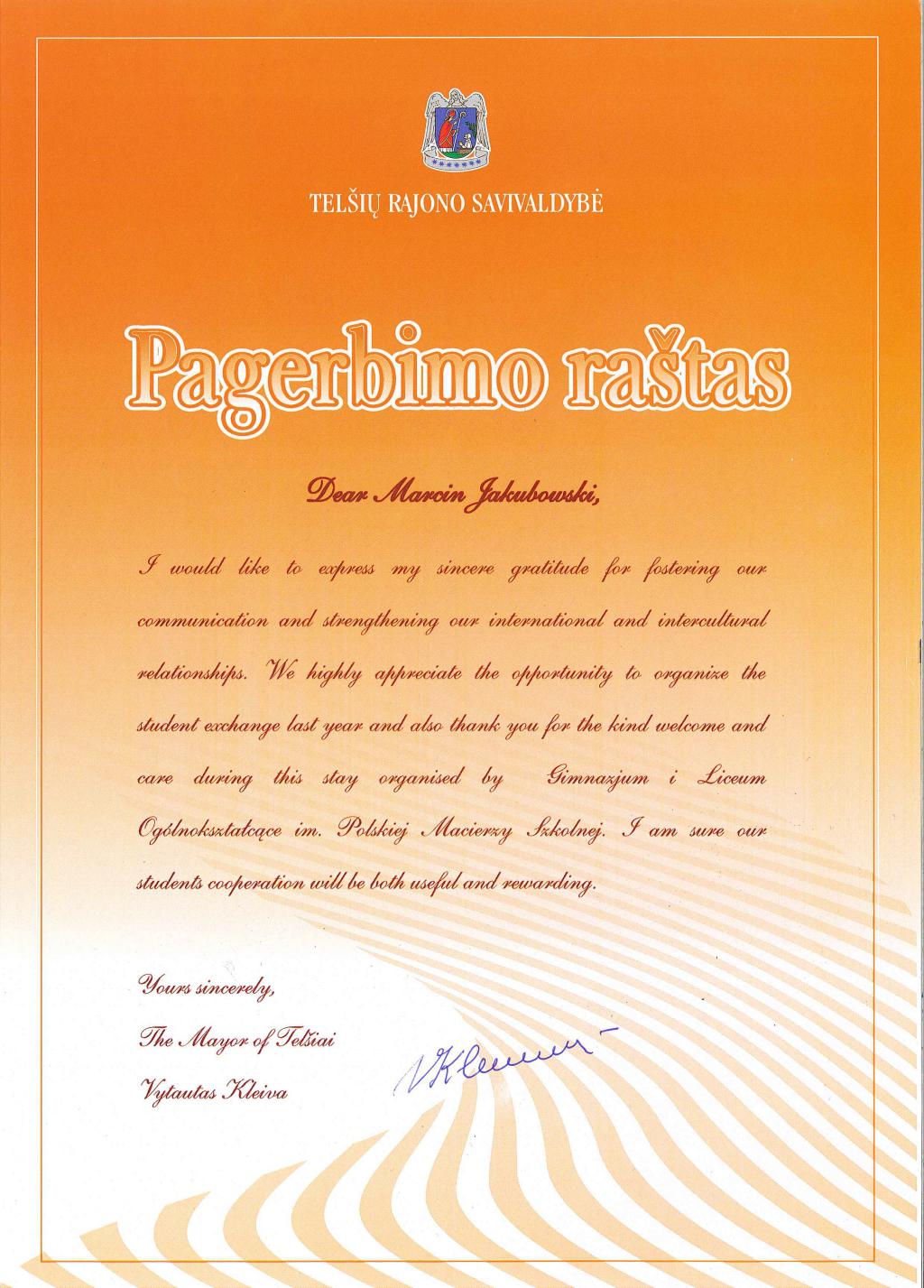 Podziękowanie dla Burmistrza Miasta z Litwy |