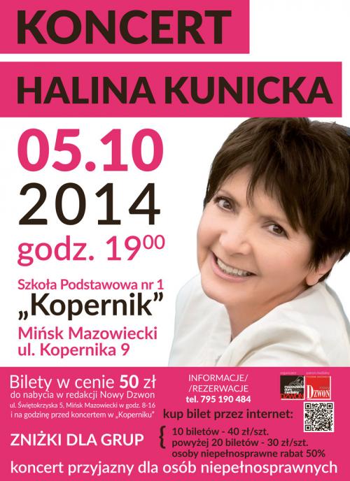 5 października o godz. 19.00 swoje największe przeboje zaśpiewa w Mińsku Mazowieckim. Na koncert zapraszamy do hali sportowej przy Szkole Podstawowej nr 1 ul. Kopernika 9. Bilety w cenie 50zł do kupienie w redakcji Tygodnika Mazowieckiego Nowy Dzwon, Mińsk Mazowiecki ul. Świętokrzyska 5 lub na godzinę przed koncertem. Prowadzimy sprzedaż przez Internet na kupbilecik.pl. Rezerwacje tel. 795 180 484. Przy zakupie 10 biletów – cena 40zł, a powyżej 20 biletów – 30zł za 1 bilet. Zapraszamy.
