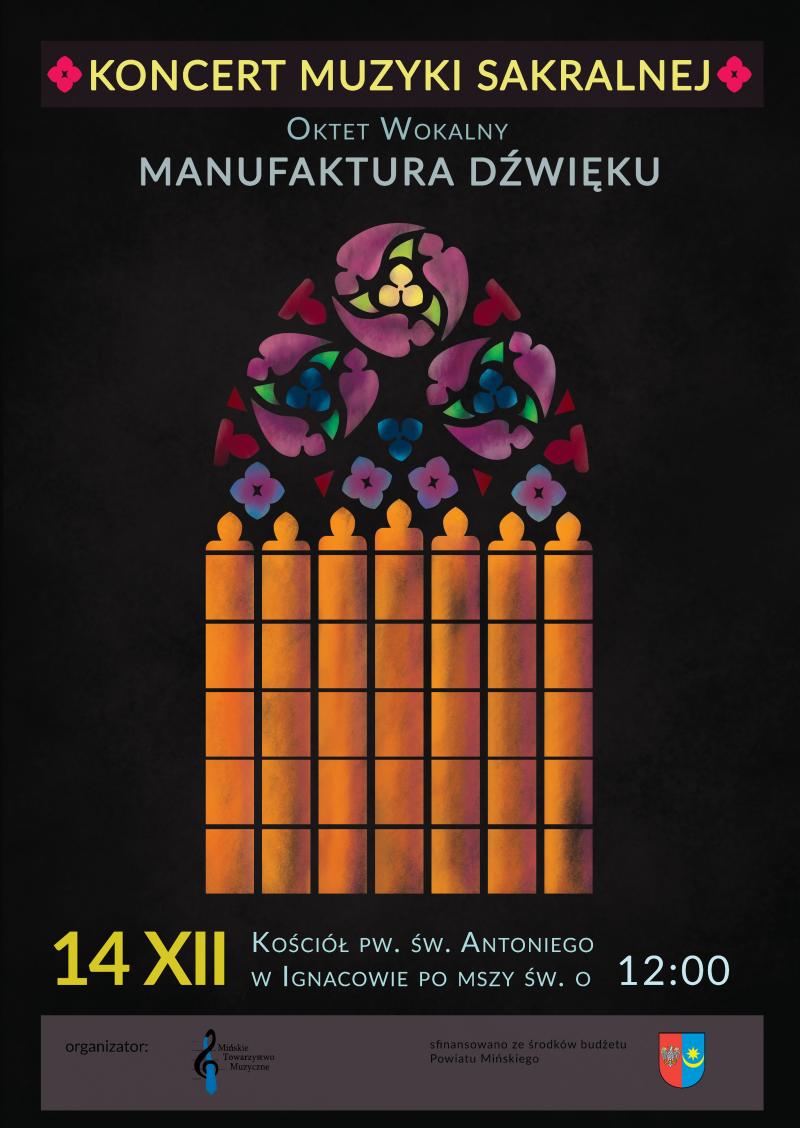 Mińskie Towarzystwo Muzyczne zaprasza 14 XII po mszy św.o godz. 12:00 do kościoła w Ignacowie. Oktet wokalny Manufaktura Dźwięku zaśpiewa koncert muzyki sakralnej. Dyryguje Emil Ławecki.