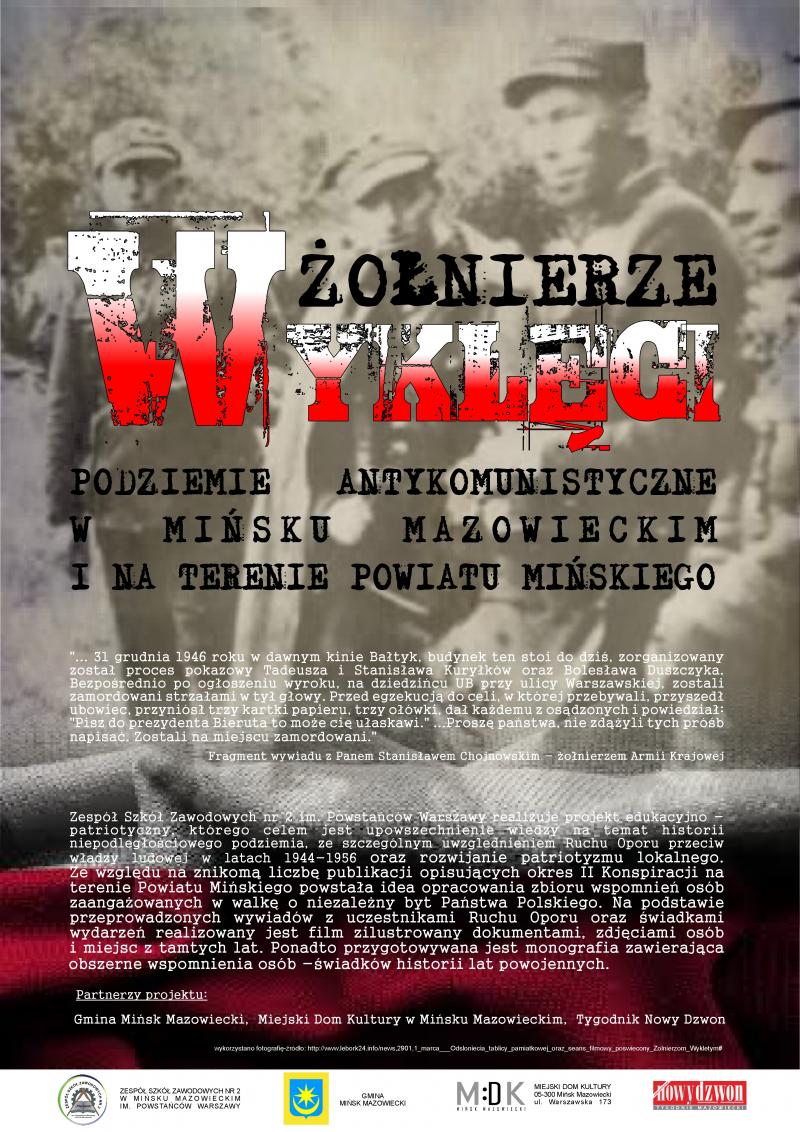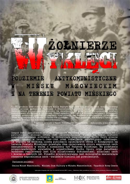 Projekt edukacyjno-patriotyczny ŻOŁNIERZE WYKLĘCI - Podziemie antykomunistyczne w Mińsku Mazowieckim i na terenie Powiatu Mińskiego - skierowany jest do mieszkańców naszego miasta i powiatu, do młodzieży szkolnej przede wszystkim. Ma na celu przywołanie pamięci polskich żołnierzy, którzy nie złożyli broni po wkroczeniu Rosjan, lecz kontynuowali walkę o wolną Polskę. We wrześniu 2013 roku rozpoczęliśmy przeprowadzanie wywiadów z uczestnikami i świadkami tamtych zdarzeń. Zebraliśmy ponad 17 godzin dokumentalnego materiału filmowego. Pierwotnie planowaliśmy zrealizowanie niezbyt długiego filmu, lecz ostatecznie obraz całości to 11 odcinków tematycznych opowiadających o zdarzeniach, które miały miejsce na naszym terenie. Pierwszy odcinek, który finansuje Urząd Gminy Mińsk Mazowiecki, opowiada o defiladzie oddziałów Armii Krajowej chwilę po zajęciu miasta i o bombardowaniu miasta przez Rosjan. Kolejny to opowieść o krótkim okresie tak zwanej dwuwładzy, czyli rządach pierwszego burmistrza i starosty, a z drugiej strony komunistów.
