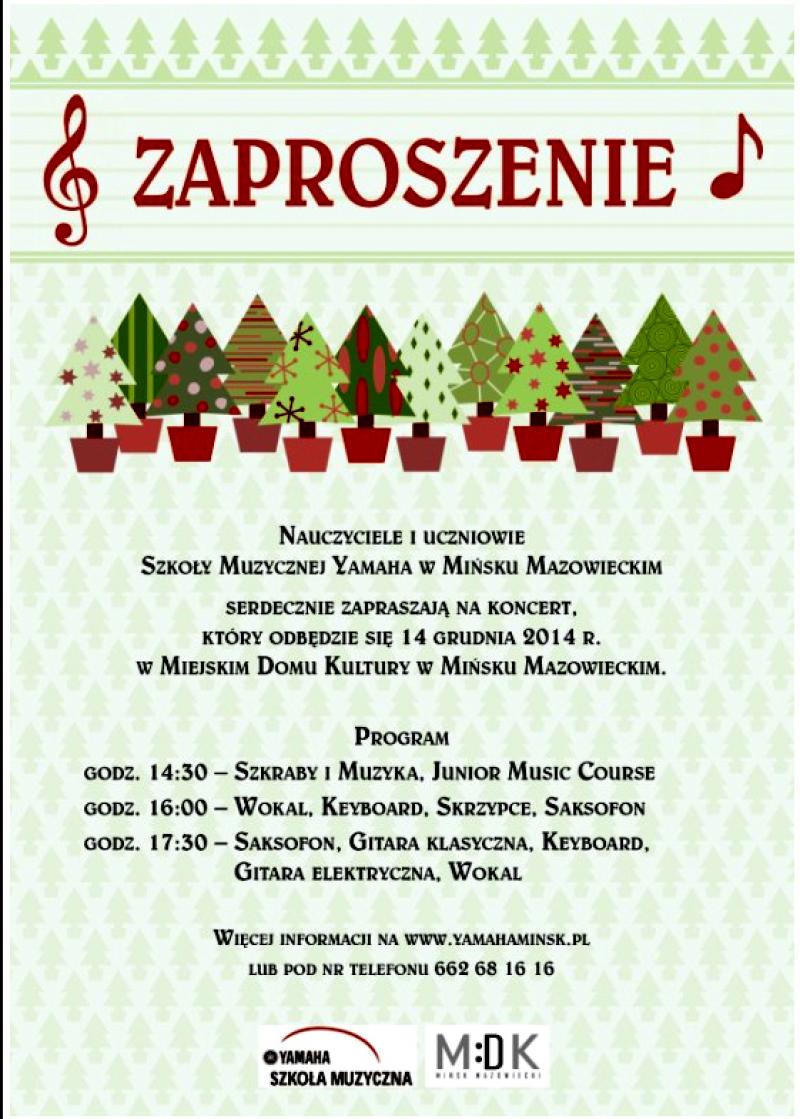 W minioną niedzielę w Miejskim Domu Kultury swoje talenty muzyczne prezentowali uczniowie mińskiej Szkoły Muzycznej Yamaha. Koncert świąteczny został zorganizowany aż w trzech turach. Najwcześniej na scenie pojawili się najmłodsi, czyli szkraby, które wraz z rodzicami nie tylko śpiewały, ale też tańczyły i mówiły wierszyki. Dla niejednego z nich był to pierwszy w życiu występ na scenie! Widzowie podziwiali też dzieci 5 i 6-letnie, które pod czujnym okiem pani Ewy Szymańskiej-Kopcińskiej uczą się grać na keyboardach w specjalnie dla nich przygotowanym programie Jounior Music Course.