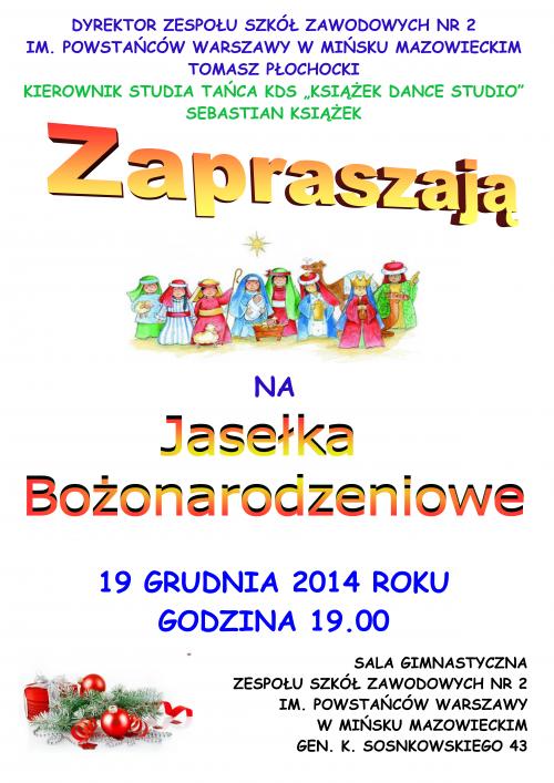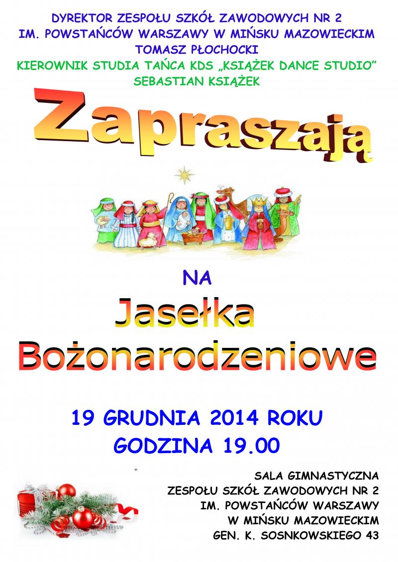 Jasełka odbyły się 19.12.2014r. o godz. 19.00 w sali gimnastycznej Zespołu Szkół Zawodowych nr 2 im. Powstańców Warszawy w Mińsku Mazowieckim. Rodzice wspólnie z dziećmi wprowadzili mieszkańców Miasta w nastrój Świąt Bożego Narodzenia.