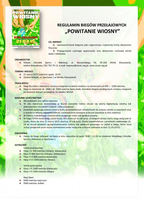 Miejski Ośrodek Sportu i Rekreacji serdecznie zaprasza wszystkich pasjonatów biegania na biegi przełajowe „Powitanie Wiosny”. Zawody odbędą się w sobotę 21 marca 2015 od godz. 9.00 na Stadionie Miejskim przy ul. Sportowej 1 w Mińsku Mazowieckim.