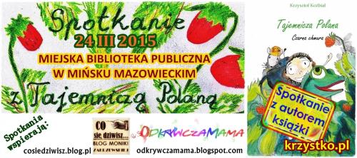 Miejska Biblioteka Publiczna w Mińsku Mazowieckim serdecznie zachęca wszystkie dzieci do wzięcia udziału w fantastycznym literackim spotkaniu. Już 24 marca, o godzinie 10:00 w bibliotece pojawi się Krzysztof Koźbiał, autor książki – „Tajemnicza Polana. Czarna chmura”. Jaka jest tajemnica polany, znajdującej się niedaleko pewnego działkowego ogródka? Dlaczego biedronki śpiewają tam biedronkowe piosenki, rośliny powodują katar, a z lasu co kwadrans wylatuje czarna chmura? Być może autor książki już wkrótce pomoże młodym czytelnikom znaleźć odpowiedzi na powyższe pytania. Zapraszamy na spotkanie!