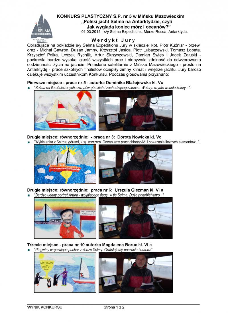 Obradujące na pokładzie s/y Selma Expeditions Jury w składzie: kpt. Piotr Kuźniar - przew. oraz - Michał Gawron, Dusan Jamny, Krzysztof Jasica, Piotr Lubaczewski, Tomasz Łopata, Krzysztof Pełka, Leszek Rychlik, Artur Skrzyszowski, Damian Święs i Jacek Załuski - podkreśla bardzo wysoką jakość wszystkich prac i niebywałą zdolność do odwzorowania codzienności życia na jachcie. Przesłane satelitarnie z Mińska Mazowieckiego - prosto na Antarktydę - prace szkolnych finalistów ociepliły zimny klimat i wnętrze jachtu. Jury bardzo dziękuje wszystkim uczestnikom Konkursu. Podczas głosowania przyznano: