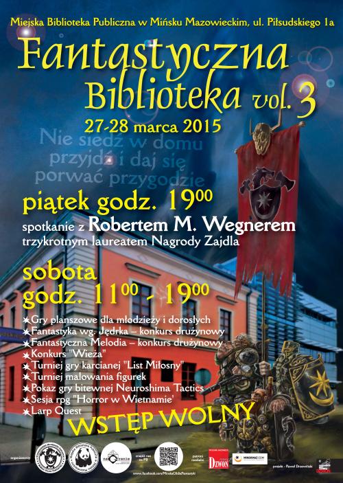 Miejska Biblioteka Publiczna i Stowarzyszenie Miłośników Fantastyki „Mińska Gildia Fantastyki” serdecznie zachęcają wszystkich fanów literatury fantasy do wzięcia udziału w organizowanych w dniach 27 – 28 marca wydarzeń pod hasłem „Fantastyczna Biblioteka”. W tym roku, podobnie jak w latach poprzednich, nie zabraknie ciekawych spotkań, gier planszowych i konkursów. 27 marca, o godzinie 19:00 „Fantastyczną Bibliotekę” otworzy spotkanie z Robertem Wegnerem, który zadebiutował w 2009 r. zbiorem „Opowieści z meekhańskiego pogranicza”. W roku 2014 otrzymał nagrodę Europejskiego Stowarzyszenia Science Fiction dla najbardziej obiecującego młodego twórcy. Ponadto jest trzykrotnym laureatem Nagrody Janusza A. Zajdla. Zapraszamy!