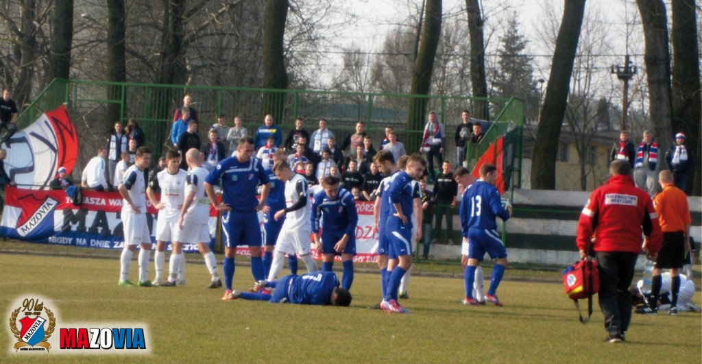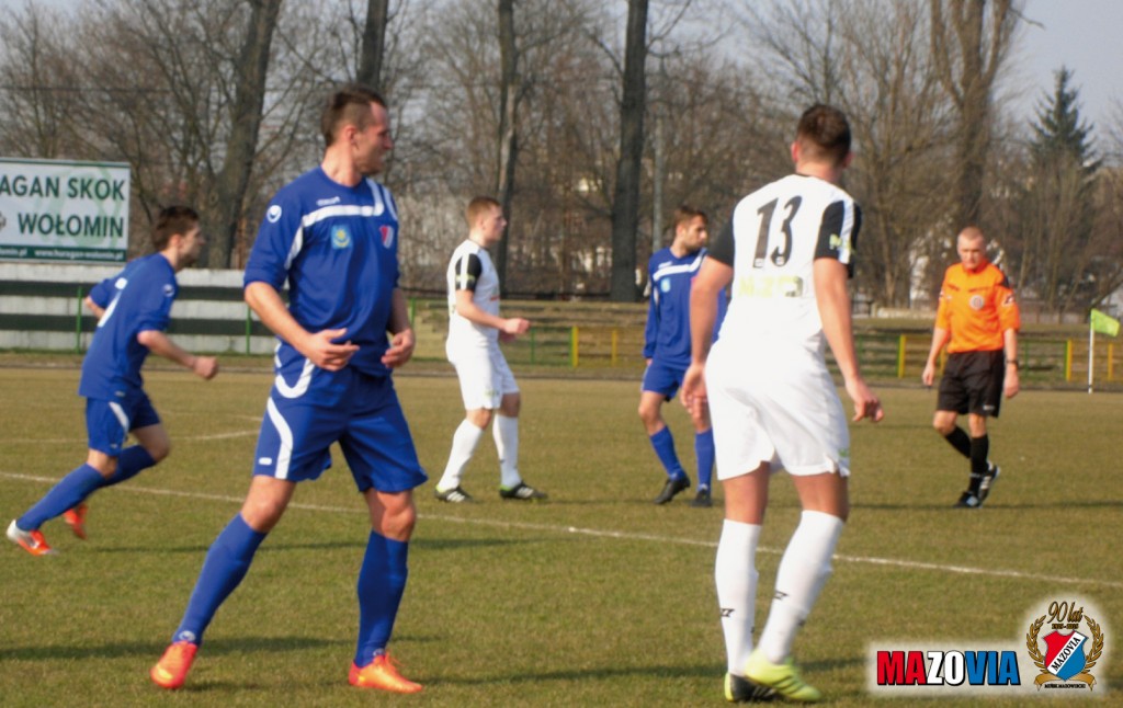 W pierwszy dzień wiosny 21 marca o godzinie 14:00 Mazovia rozegrał swój kolejny mecz o Mistrzostwo IV ligi. Rywalem był Huragan Wołomin, którego głównym atutem w tym meczu miało być własne boisko. Mecz od początku był bardzo wyrównany i obie drużyny przez pierwsze minuty spotkania badały się wzajemnie. Jednak Mińscy piłkarze już w 5 minucie spotkania stwarzają doskonałą sytuacje - po wrzutce w pole karne Bondara uderza piłkę głową, jednak fantastycznie interweniuje bramkarz gospodarzy wybijając piłkę na rzut rożny. Dalszy ciąg pierwszej połowy to bardzo dużo walki w środkowej części boiska gdzie Puciłowski, Krajewski i Kozakiewicz bardzo ciężko pracowali na to by tworzyć sytuacje dla Mazovii ale także na to by jak najszybciej przerywać ataki Huraganu. Mecz był bardzo zacięty a gra opierała się na twardej grze. Do przerwy drużyna z Wołomina stworzyła sobie jedną dogodną sytuację. Po przerwie na boisko Mazovia wychodzi z jedną zmianą Dawida Mataka zastępuje Marcin Kowalczyk. W drugiej połowie lekką inicjatywę przyjął Huragan Wołomin, który to coraz częściej znajdował się z piłką w okolicach bramki strzeżonej przez Szelągowskiego, jednak albo nasz bramkarz świetnie bronił albo obrońcy nie dopuszczali do oddania strzału. W 70 minucie spotkania świetnym "crosem" popisuje się Puciłowski, piłka trafia pod nogi Kowalczyka ten pędzi lewym skrzydłem mija obrońcę rywala zagrywa w okolice 16 metra gdzie jest Kozakiewicz ten strzela lewą nogą jednak piłka mija "długi słupek" i tylko jęk zawodu na trybunach w sektorze goście gdzie świetny doping prowadzili kibice z Mińska. Obie drużyny walczyły do ostatniej minuty o to by w tym meczu zdobyć 3 punkty, nikt nie odstawiał nogi. W 80 minucie Bartek Kozakiewicz zostaje brutalnie faulowany przez zawodnika Huraganu. Sędzia pokazuje tylko żółtą kartkę, a Bartek opuszcza boisko na noszach. Trener Puchalski jest zmuszony dokonać zmiany i kontuzjowanego Kozakiewicza zastępuje wracającym po kontuzji kolana Danielem Smugą. Wynik 0-0 utrzymuje się do końca meczu. Po dwóch zwycięstwach lekki niedosyt pozostaje, mimo wszystko należy jednak cieszyć się z dobrej gry Mińszczan oraz punktu zdobytego na wyjątkowo trudnym terenie.