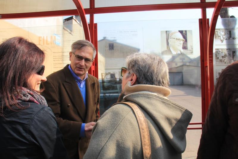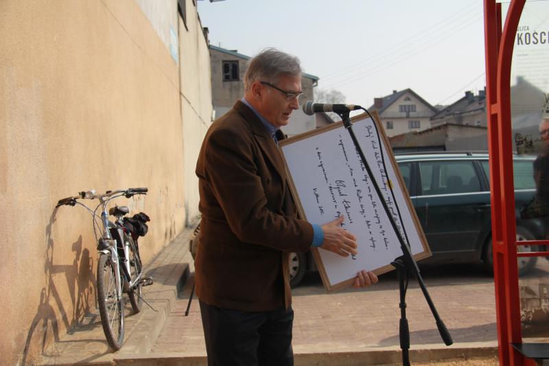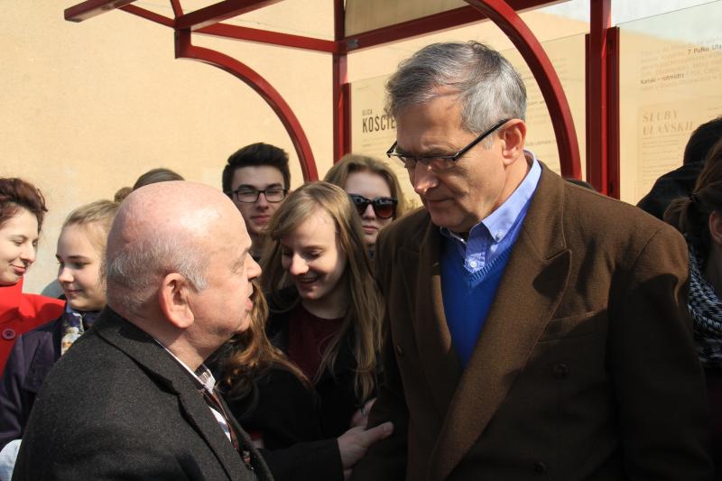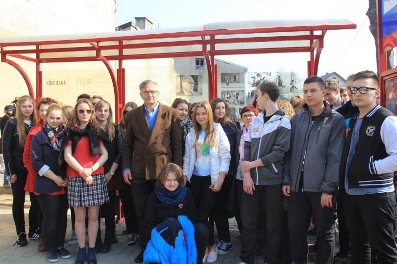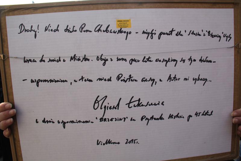 Niespodzianką dla zebranych przy przystanku mińszczan był gość specjalny w osobie aktora Olgierda Łukaszewicza, który zagrał Stasia w „Brzezinie”. Wspominał Mińsk Mazowiecki lat 70-tych, relacje z lokalnymi statystami, czy fakt, że – o ile dobrze pamięta – grali w tym filmie Wajdy bez scenariusza, improwizując. Od mińskiego artysty otrzymał na pamiątkę tamtych dni grafikę przedstawiającą nasze miasto. Teraz postanowił „zwrócić” mińszczanom to dzieło, a swoje myśli zawarł w osobistej dedykacji: