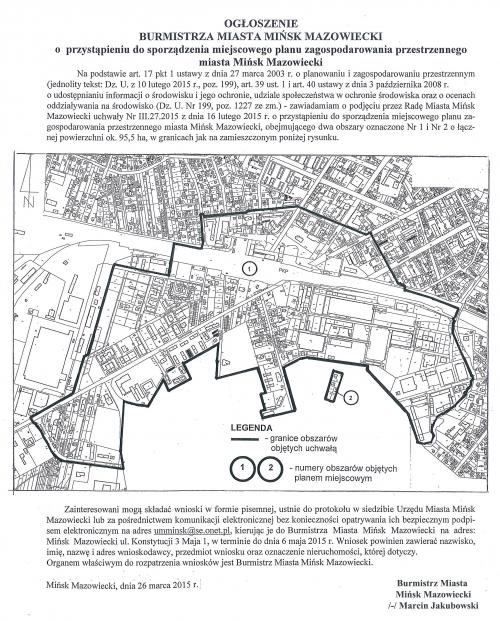 Ogłoszenie Burmistrza Miasta o przystąpieniu do sporządzenia miejscowego planu zagospodarowania przestrzennego miasta Mińsk Mazowiecki |
