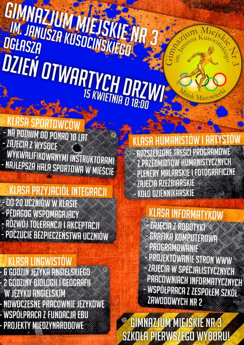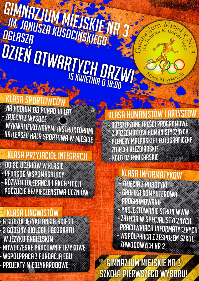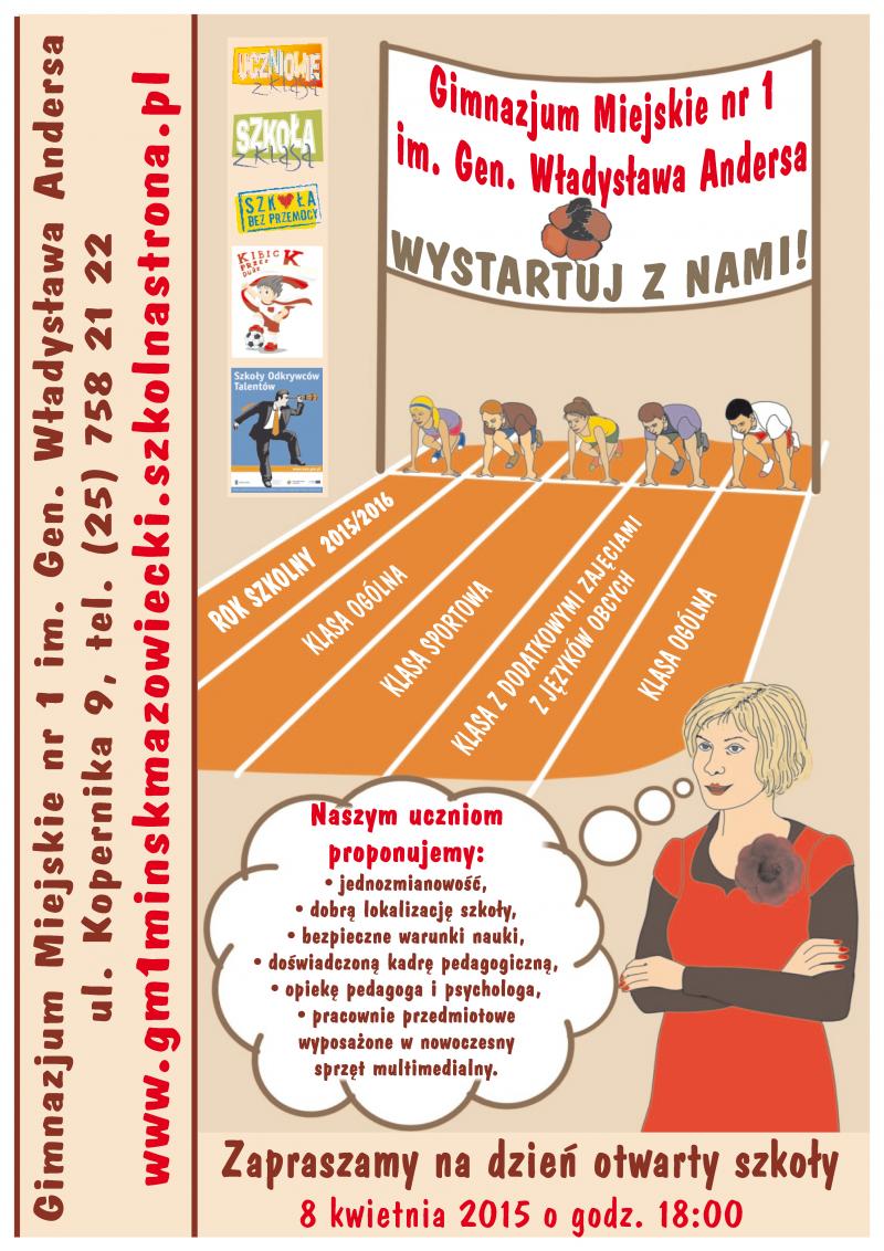 Z dniem 1 września 2015 roku przy akceptacji Burmistrza Miasta oraz współpracy z MKS „Olimp” i MOSiR w Gimnazjum Miejskim nr 1 im. Gen. Władysława Andersa w Mińsku Mazowieckim zostanie utworzona klasa sportowa o specjalności piłka siatkowa – dziewczęta i piłka nożna – chłopcy dla urodzonych w roku 2002.
