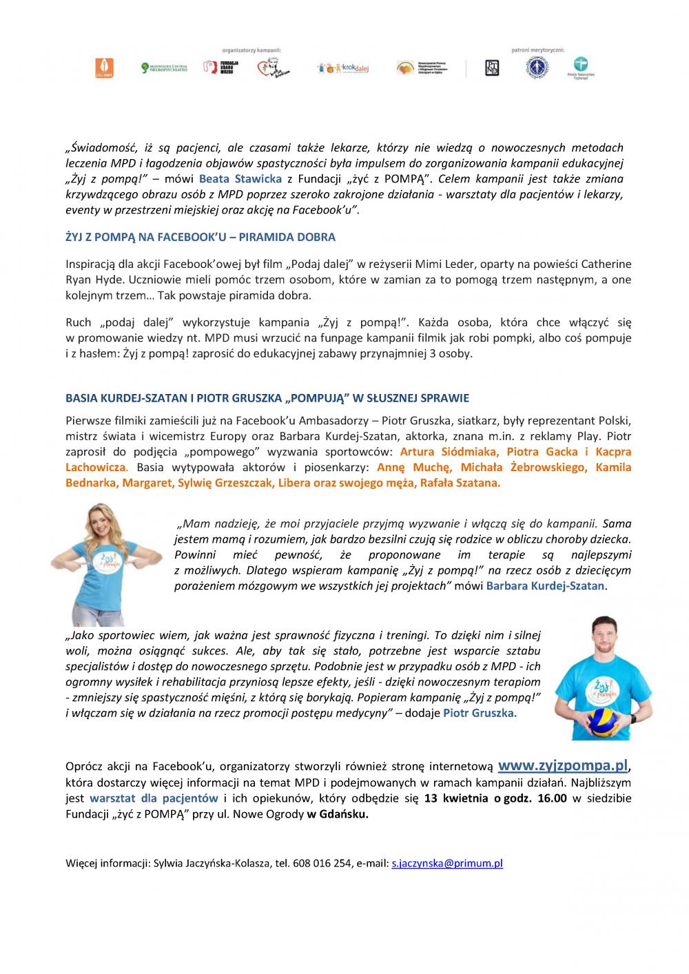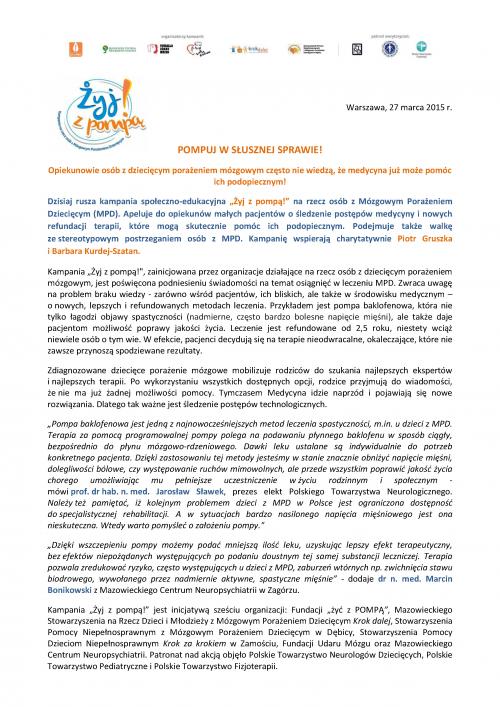 Kampania społeczno-edukacyjna "Żyj z pompą!" na rzecz osób z Mózgowym Porażeniem Dziecięcym (MPD) ruszyła 27 marca 2015r.