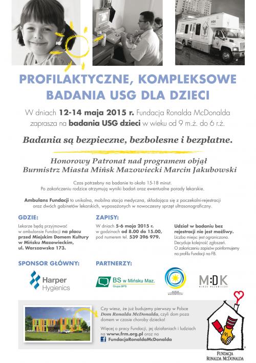 W dniach 12 - 14 maja b.r. Fundacja Ronalda McDonalda we współpracy z Miastem Mińsk Mazowiecki zaprasza na badania USG dzieci w wieku od 9 miesięcy do 6. roku życia włącznie.