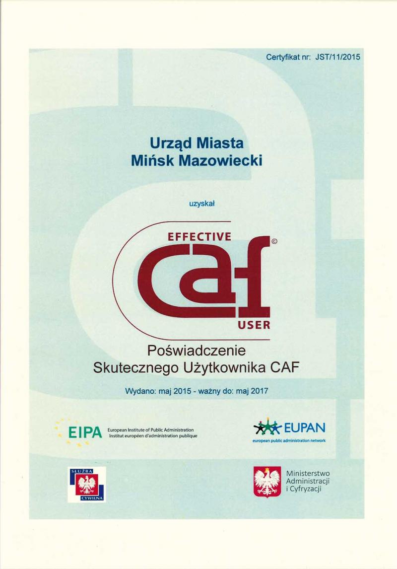 Certyfikaty Ministra Administracji i Cyfryzacji pt. Skuteczny Użytkownik Systemu CAF stanowią dowód na wypełnianie zaleceń Komisji Europejskiej. Procedura poświadczenia poprawności stosowania metody CAF przez JST jest realizowana przez MAC we współpracy z Kancelarią Prezesa Rady Ministrów i Małopolską Szkołą Administracji Publicznej. Procedura ta jest bezpłatna i skutkuje przyznaniem certyfikatu Ministra Administracji i Cyfryzacji na okres 2 lat.
