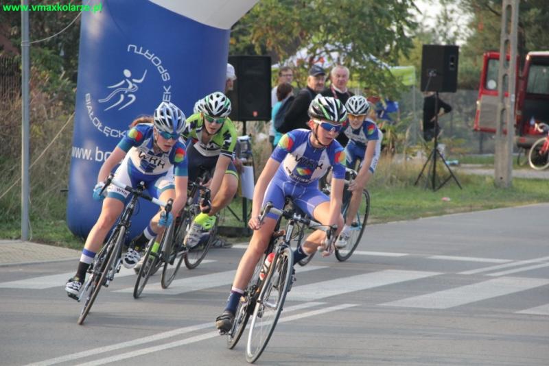 Jeszcze tego samego dnia młody V-MAX musiał sprawnie przemieścić się na drugą stronę stolicy i szybko zmienić sprzęt na rowery szosowe. W Białołęce rozegrano finał Ligi Szosowej Mazowsza, w której od początku tego sezonu bardzo skuteczni są młodzi mińscy kolarze. Pierwszą petardę rzucił nasz „Młodzik” – Jakub Soszka, pewnie wygrywając jazdę indywidualną na czas. Tuż przed wieczorem kibice oczekiwali na emocjonujące wyścigi ze startu wspólnego. Trochę szczęścia zabrakło młodziutkiej Zuzi Sierhej, która zmęczona porannym startem na maratonie MTB w – przyjechała na metę czwarta. W kategoriach „Młodzików” i „Juniorów Młodszych” mińscy kolarze mieli dwa mocne punkty i nieskrywane duże aspiracje na zwycięstwo. Kuba Soszka niczym wytrawny mistrz rozprawił się z licznym peletonem zostawiając za plecami najsilniejszych rywali z Warszawskiego Klubu Kolarskiego, BDC Huragan Wołomin, czy BSA Pro-Tour.