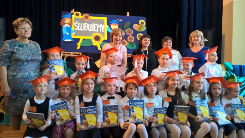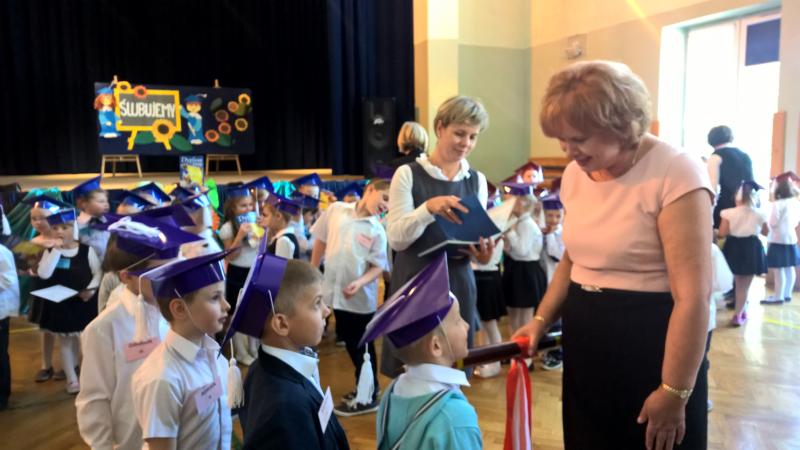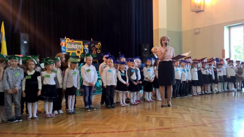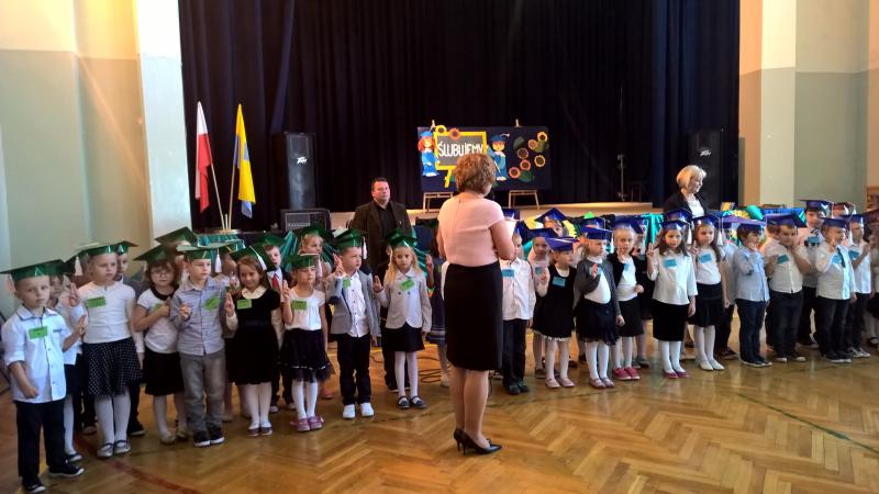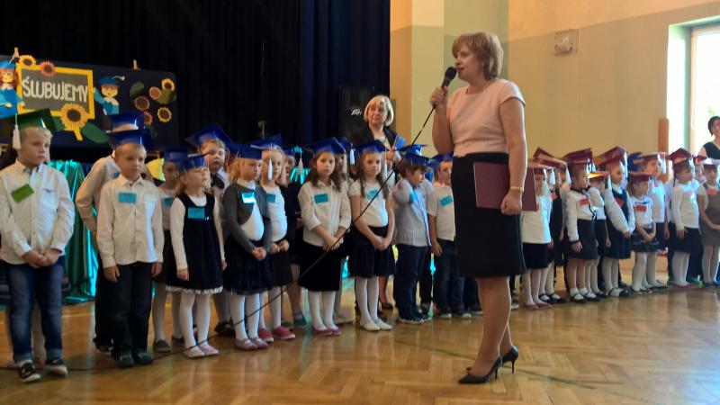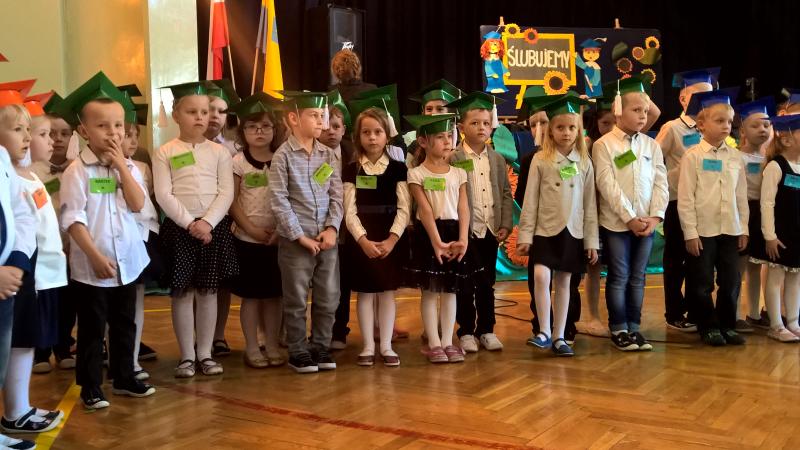 Zanim pierwszoklasiści złożyli uroczyste przyrzeczenie, zaprezentowali to, czego zdążyli się nauczyć przez krótki czas pobytu w szkole. Zapału, radości i ogromnego wdzięku nie można było nikomu odmówić, dlatego występ wszystkim bardzo się podobał. Wspaniale przygotowane dzieci pięknie recytowały wiersze i śpiewały piosenki. Wykazały się wiedzą o ojczyźnie, udowodniły, że znają obowiązki ucznia, a także zasady dotyczące własnego bezpieczeństwa. Kiedy pierwszaki pomyślnie przeszły ten trudny egzamin, nastąpił kulminacyjny punkt uroczystości – ślubowanie. Obietnica, którą złożyli uczniowie zobowiązywała do poważnego i mądrego traktowania nauki. Jak nakazuje szkolna tradycja następnie odbyło się pasowanie na ucznia, którego dokonała pięknym kolorowym ołówkiem pani dyrektor, Anna Zalewska.