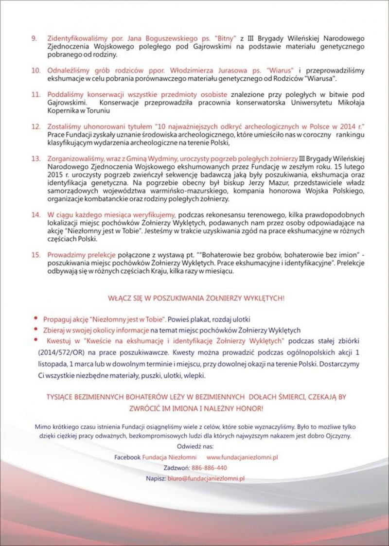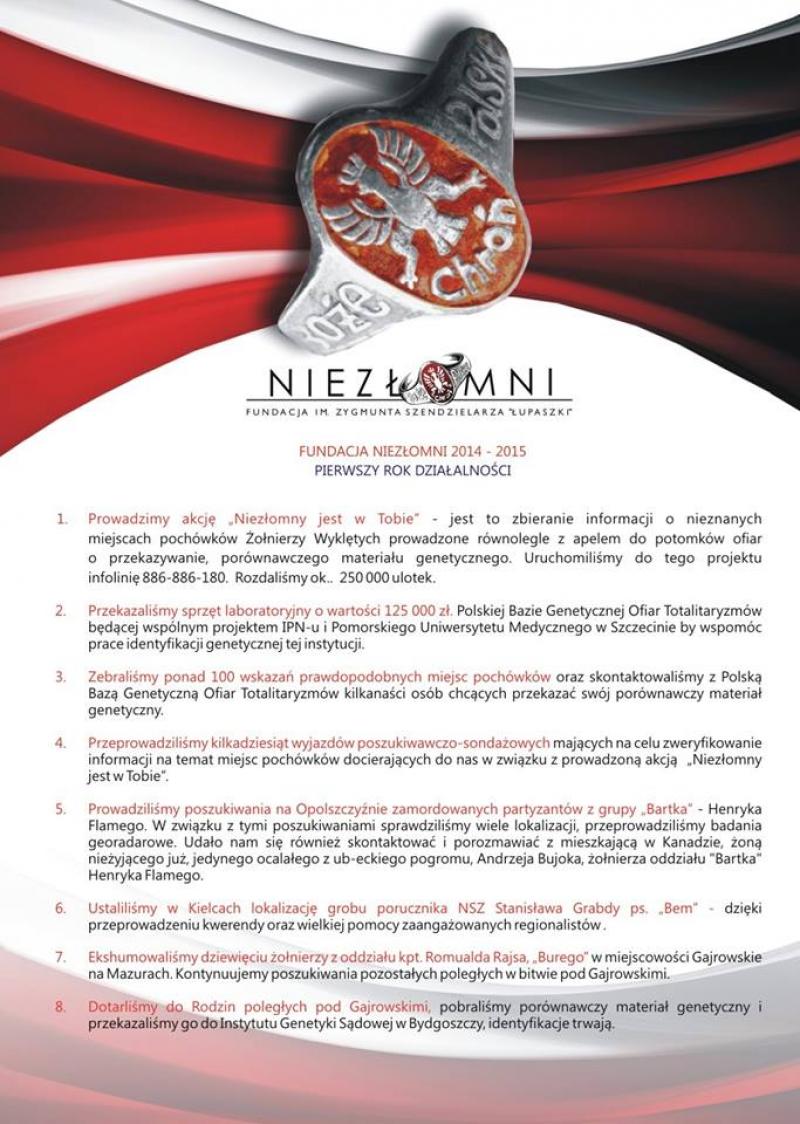 Środki przeznaczono na prowadzone przez Fundację Niezłomni poszukiwania, ekshumacje, identyfikację genetyczną oraz organizację uroczystych pogrzebów Żołnierzy Wyklętych.