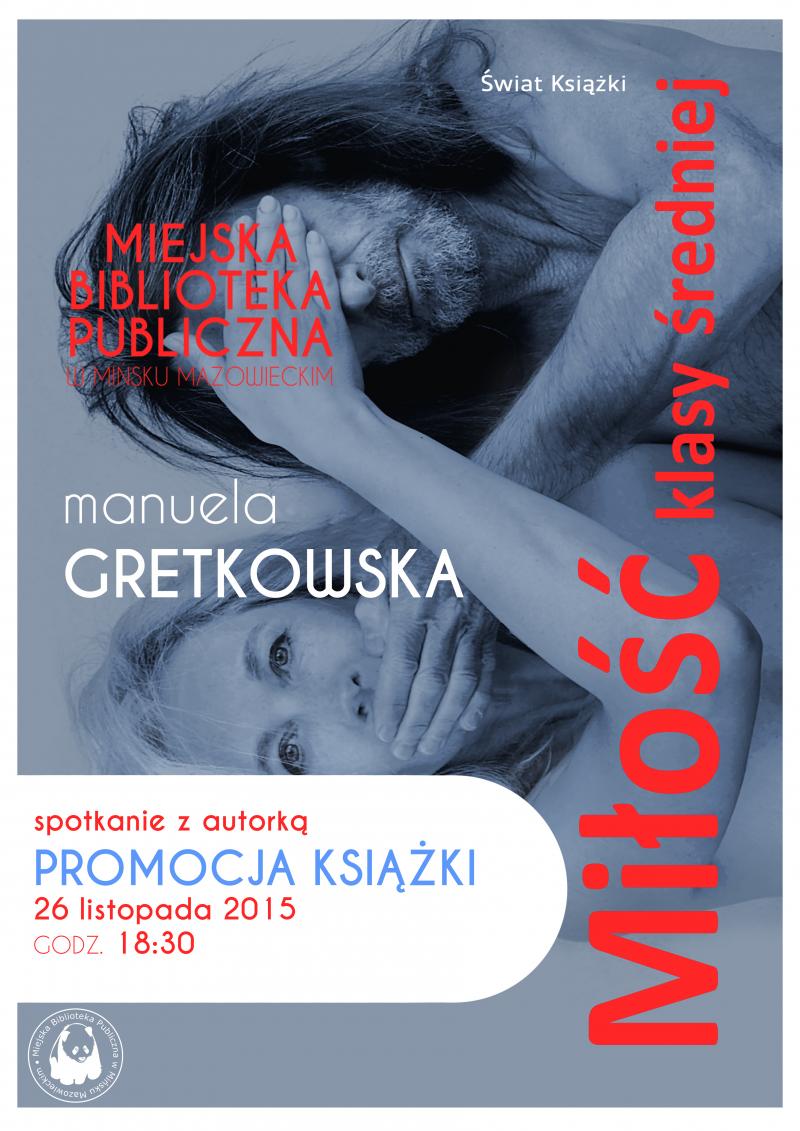 26 listopada, o godz. 18:30 odbędzie się spotkanie z Manuelą Gretkowską, której najnowsza książka pt. „Miłość klasy średniej”, napisana wspólnie z Piotrem Pietuchą, przedstawia kobiecy i męski punkt widzenia na kryzys w związku. W pierwszej opowieści, zatytułowanej „Kalifornia” poznajemy zdesperowaną kobietę, która ucieka przed małżeńskimi problemami. Druga część - „Domino” opisuje przypadkowe spotkanie przyjaciół z dawnych lat, które burzy spokój i niszczy wypracowaną z trudem stabilizację. Manuela Gretkowska znana jest czytelnikom z wielu znakomitych powieści, takich jak: „Kobieta i mężczyzna”, „Obywatelka”, „Miłość po polsku”, „Trans”, czy „Agent”. Serdecznie zapraszamy na spotkanie!