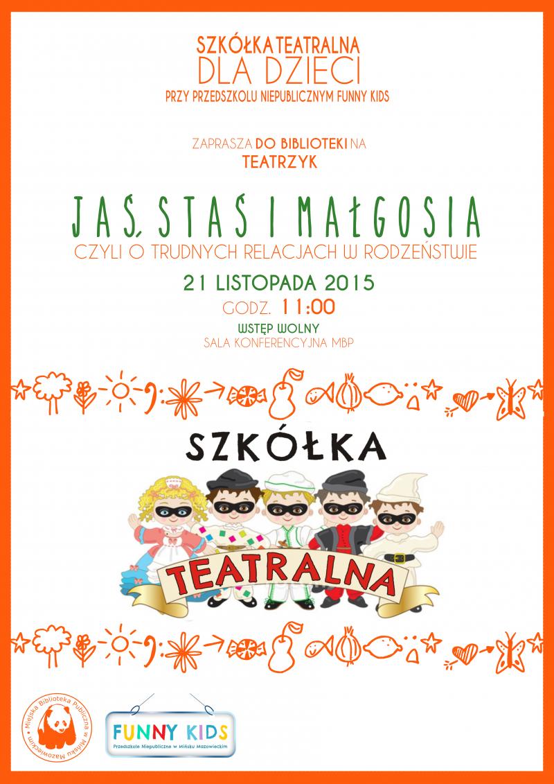 21 listopada, o godz. 11:00 zapraszamy wszystkie dzieci do biblioteki na przedstawienie pt. „Jaś, Staś i Małgosia”. Wystąpią młodzi aktorzy ze Szkółki Teatralnej, działającej przy Przedszkolu Niepublicznym „Funny Kids”. Bajka opowiada o dwóch braciach Jasiu i Stasiu, którzy bardzo dokuczali swojej siostrze, przeszkadzali w zabawach, wyśmiewali ją. Nadszedł jednak dzień, w którym chłopcy zrozumieli, jak bardzo kochają swoją siostrzyczkę. Co takiego się wydarzyło? Dlaczego Jaś i Staś zmienili swoje postępowanie wobec Małgosi? Dowiecie się, jeśli w sobotnie popołudnie odwiedzicie bibliotekę!