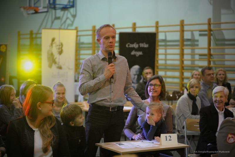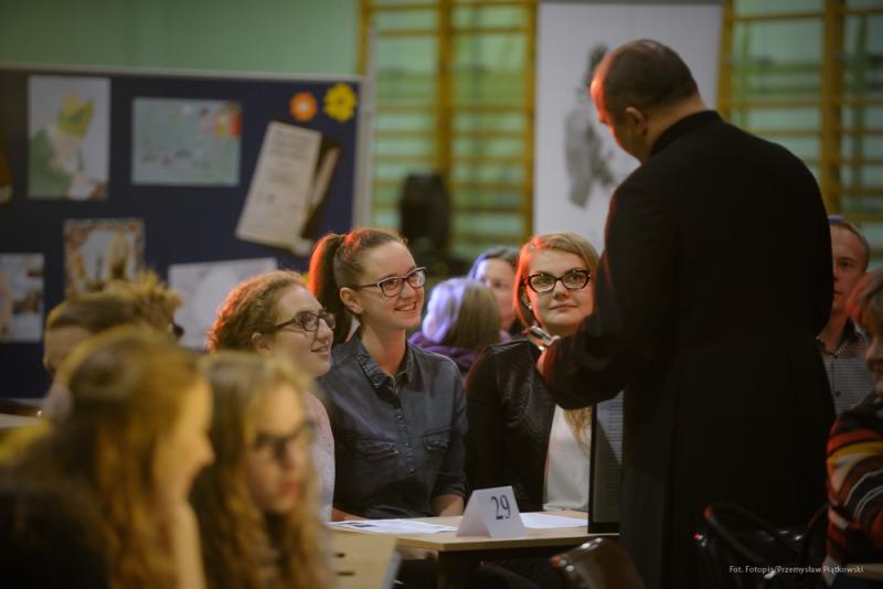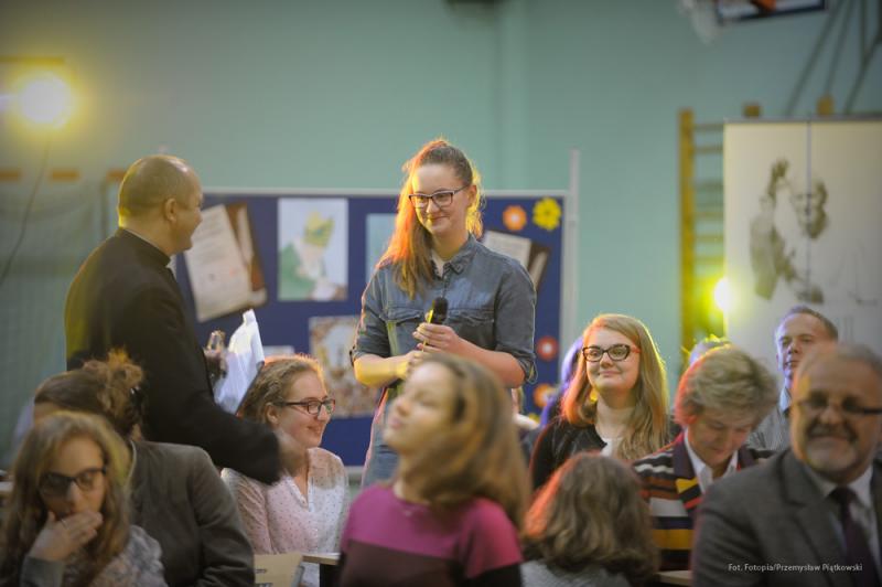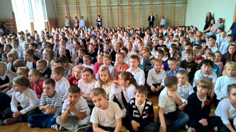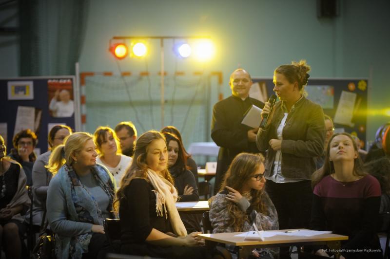 Pierwsze z nich to spotkanie dla uczniów szkół podstawowych z Mińska Mazowieckiego i gminy mińskiej ze znawcą biografii Jana Pawła II – panem Pawłem Zuchniewiczem. Ponad 200 młodych uczestników spotkania 16 października w budynku gimnazjum w Hucie Mińskiej wysłuchało opowieści o życiu i nauczaniu papieża – Polaka. Gospodarze przygotowali oprawę muzyczną i plastyczną przedsięwzięcia, w którym oprócz uczniów, opiekunów i dyrektorów trzech „papieskich szkół” wziął udział także wójt gminy Mińsk Mazowiecki pan Janusz Piechoski.
